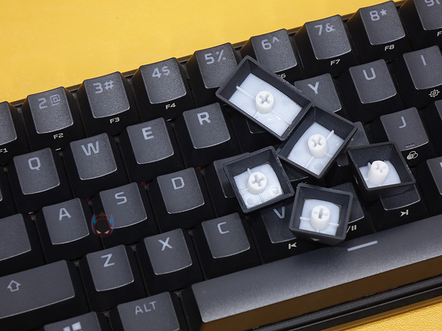 키-캡은 앞서 제품박스에서 확인했듯이 PBT재질의 이중사출 키-캡입니다. 그동안 하이퍼엑스 키보드 제품들이 줄곧 ABS재질 키-캡을 사용해서 일부 사용자들은 가격대비 늘 아쉬운 부분으로 지적했는데, 이번 Alloy Origins 60 키보드에서 처음으로 PBT 키-캡을 사용했습니다. 그리고, 스위치는 역시 오리진 시리즈이기때문에 하이퍼엑스 자체개발 스위치 HyperX 스위치가 적용되었으며, 국내외 상관없이 현재 적용되고 있는 스위치는 레드 스위치 한가지 입니다. 그리고, 스테일라이저는 체리식이고, 윤활처리도 기본적으로 되어 있죠.