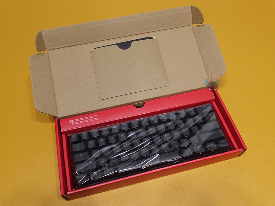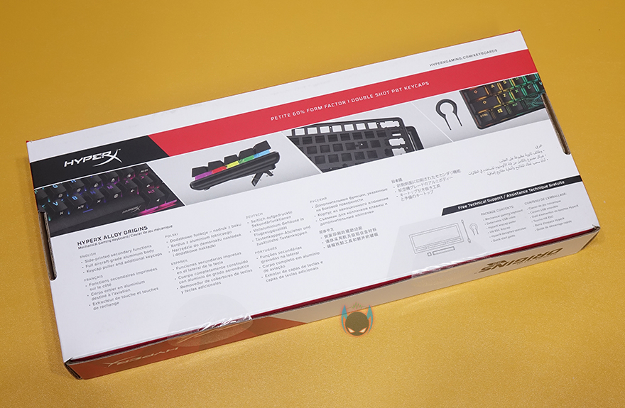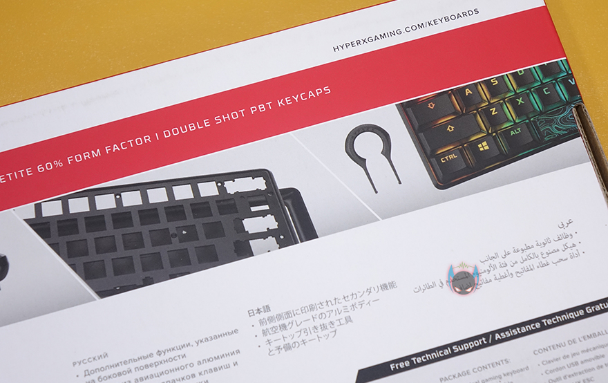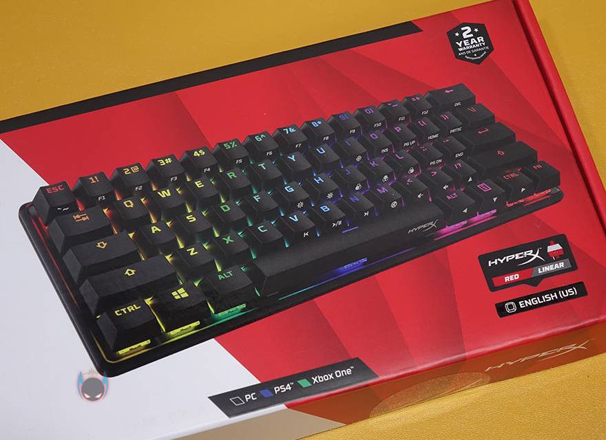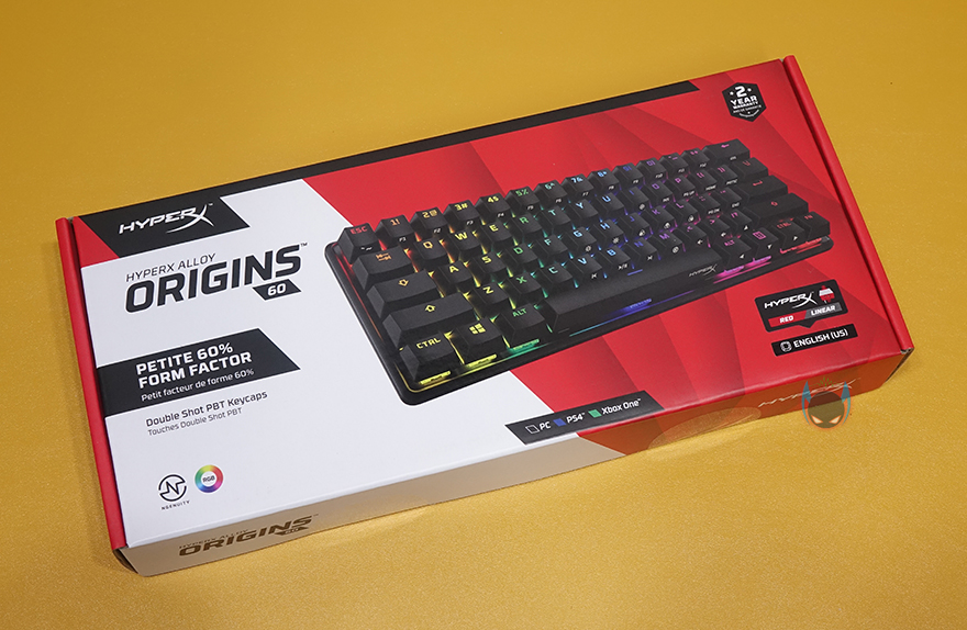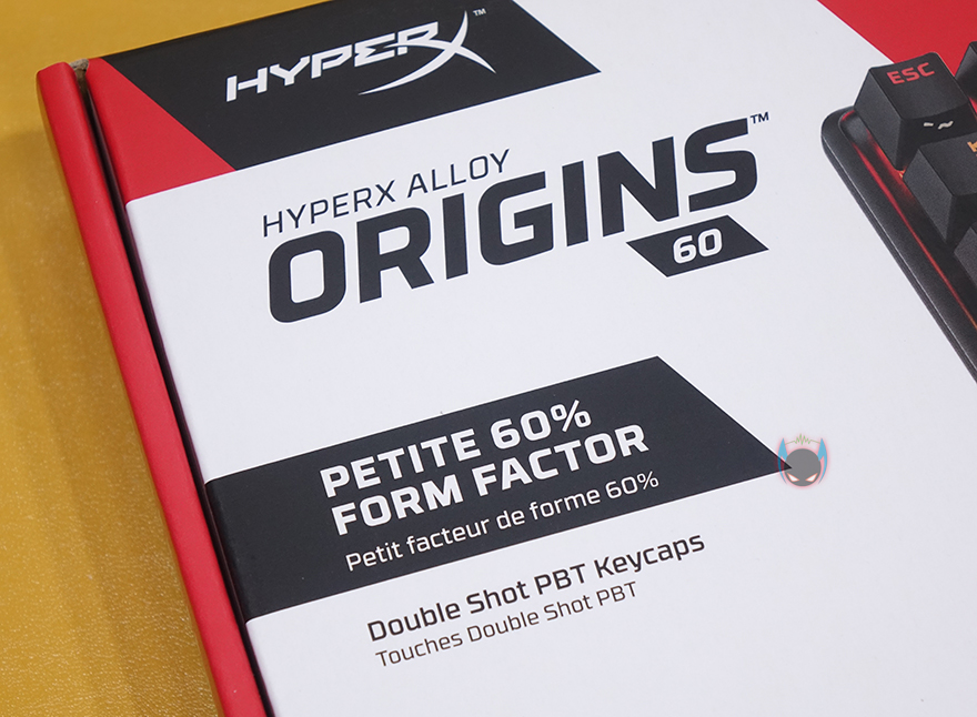 하이퍼엑스 Alloy Origins 60 키보드는 시작에서도 언급했듯이 60% 사이즈를 가졌기때문에, 지금까지 나온 오리진 시리즈 중 제품박스도 가장 작습니다. 그래도 팩키지 디자인은 크게 벗어나지 않는데, 모델명, 사이즈와 함께 눈길을 끄는 문구가 있으니, 바로 PBT재질의 이중사출 키-캡입니다. 뒤에서 다시 언급하겠지만, 제품 기본 키-캡으로 PBT 키-캡을 갖춘 건 이번이 처음이죠. 그리고, 오리진 시리즈의 제품이기 때문에 당연히 하이퍼엑스 자체개발 스위치 HyperX 스위치탑재 문구도 확인할 수 있고, PC와 콘솔기기 호환표기도 확인할 수 있습니다.