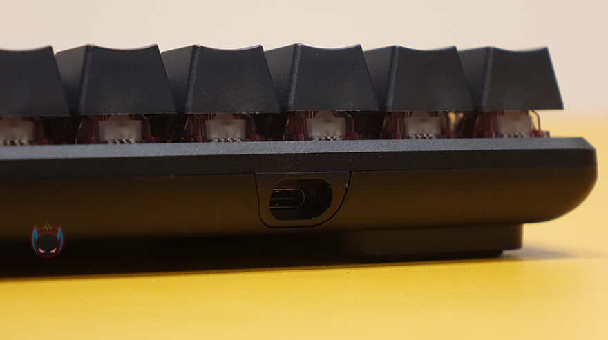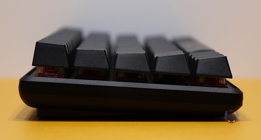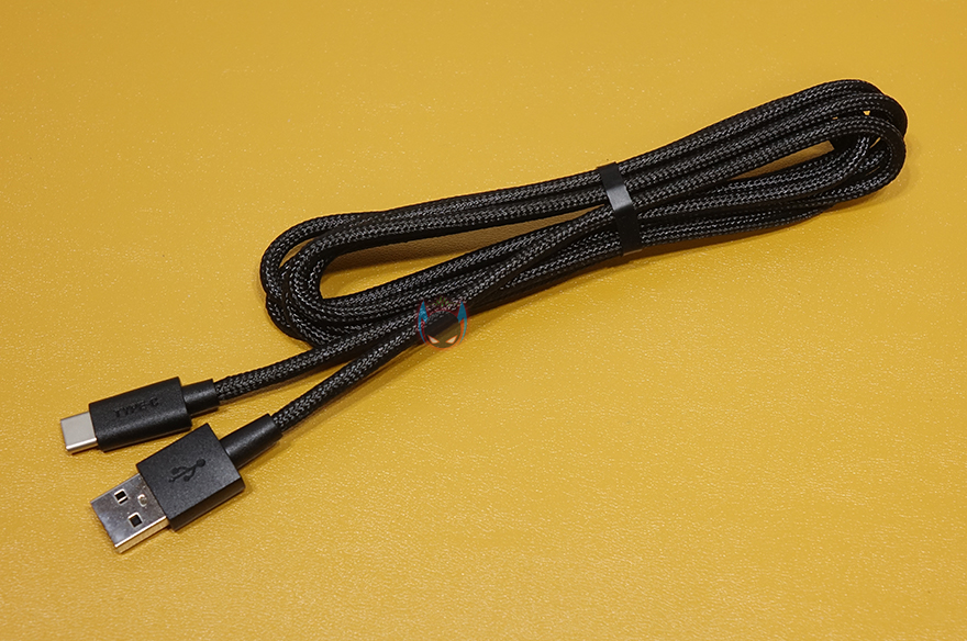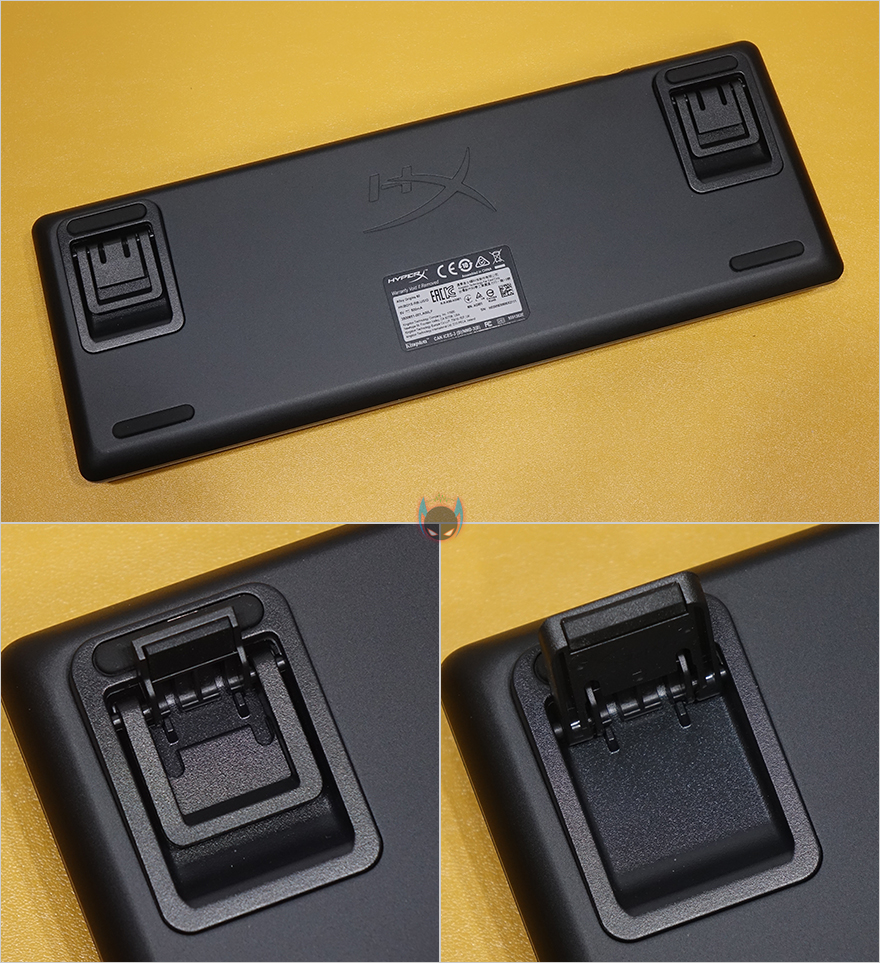 그리고, 키보드 측면에서 보면 타이핑에 최적화라 불리우는 스텝-스컬쳐2 단계배열을 갖추고 있으며, 키보드 밑바닥부분에는 중앙에 하이퍼엑스 로고를 음각으로 표시해놨으며, 각 모서리 부근에 미끄럼방지 고무패드가 부착되어 있습니다. 또한, 앞부분에는 2단 높낮이 받침대도 적용되어 있어서, 기본높이까지 포함해서 총 3단계로 높이조절을 할 수 있습니다. 분리형 USB 전원케이블 길이는 1.8m이고, 꼬임방지를 위해 파라코드 소재가 사용되었으며, 키보드 연결은 Type-C, PC나 콘솔기기쪽 연결은 Type-A 인터페이스를 가졌습니다.