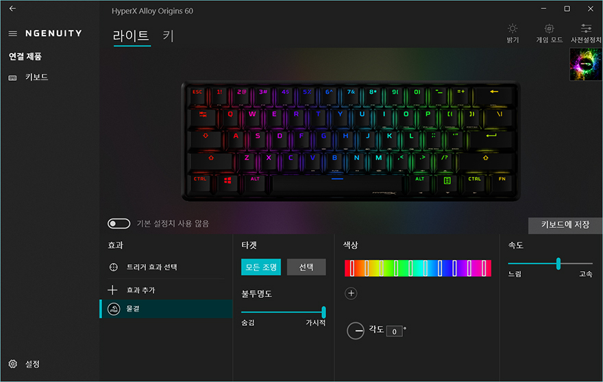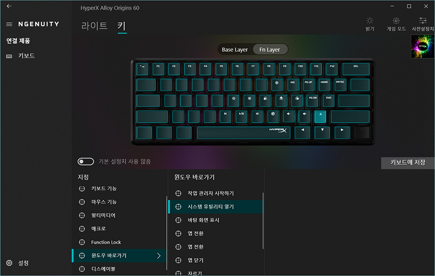 마지막으로 Alloy Origins 60 키보드 역시 하이퍼엑스의 공용 소프트웨어 NGenuity를 지원해주고 있는데, 프로그램을 실행하면 지원되는 기능은 먼저 나왔던 오리진 시리즈 키보드 제품들과 동일합니다. 크게 메뉴는 라이트와 키로 나뉘어지고, 라이트에는 기본상태로 작동되는 루프형 모드에 총 7가지 모드가 있고, 키 입력시 작동하는 트리거형 모드에는 총 3가지 모드를 지원해주고 있습니다. 그리고, 키 메뉴에는 키 기능변경 설정으로 기본 키 기능변경외에 Fn키 기능변경 지원해주고 있어서 구분해서 설정할 수 있습니다. 이외에도 프로그램으로 밝기조절은 1%단위씩 할 수 있으며, 게임모드는 윈도우키 잠금해제 외에 추가 잠금해제 기능들을 활성화/바활성화 할 수 있으며, 프로그램에서 설정한 값은 바로바로 사용할 수 있지만, 온보드 프로파일에도 저장할 수 있습니다.