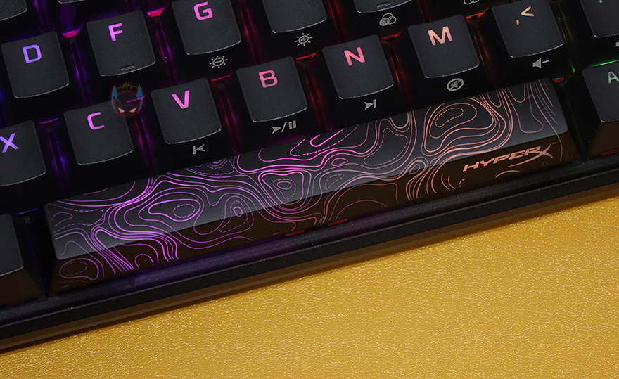 하이퍼엑스 Alloy Origins 60은 60% 미니키보드이기때문에 Fn키 조합으로 부가기능 외에 풀-배열 키보드에서 사용되는 일부 키들도 Fn키 조합으로 사용되는데, 먼저 F숫자키(F1~F12)는 1~0, -, =키와 함께 Fn키 조합으로 사용되며, ESC키는 `,~ 2가지 표시되어 있는데, Fn키 조합으로 사용하면 `가 입력되고, Shift키와 사용하면 ~가 입력됩니다. 그리고, Insert/Delete/Home/End/PageUp/PageDown 특수키 6개도 Alloy Origins 60에선 Fn키 조합으로 사용되며, 나머지 부가기능들은 먼저 나온 오리진 시리즈 제품들과 동일한 기능들로 지원해주고 있습니다. I키는 게임모드, G/H키는 밝기조절, J/K/L키는 온보드 프로파일, V/B/N은 재생컨트롤, M/,/./?키는 음소거 및 볼륨조절 기능이 되겠습니다. Fn키 조합으로 사용되는 키들은 모두 키-캡 아래에 표기를 해놨기 때문에 어렵지 않게 사용할 수 있습니다.