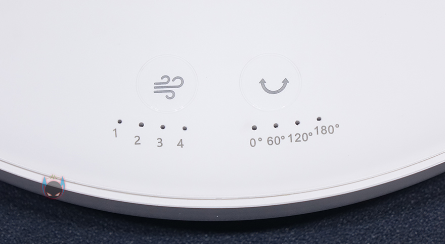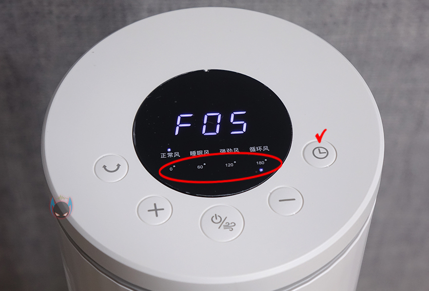 마지막으로 무선 리모컨 같은경우에는 타워 팬 위에 올려놓을 수 있게 똑같은 지름 크기를 가졌으며, 충전해서 사용할 수 있게 뒷면에 USB Type-C 포트가 적용되어 있습니다. 터치 버튼들은 기능 표시를 해놨기 때문에 쉽게 알아볼 수 있는데, 왼쪽부터 회전, 바람세기 Up, 전원/바람모드, 바람세기 Down, 타이머 기능이죠. 그리고, 중심부에는 작동상태를 확인할 수 있는 LED 디스플레이가 적용되어 있는데, 표기된 숫자는 앞서 받침대에서 봤던 회전 각도 표시이며, 바로 위해 한자로 적힌 부분들은 바람모드로 왼쪽부터 일반바람/수면바람/강한바람/순환바람입니다.