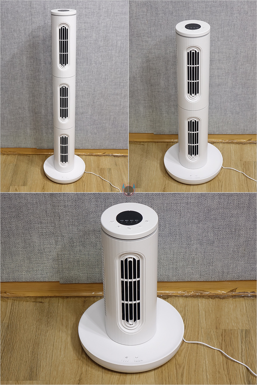 직접 Edon E360 타워형 선풍기를 사용해보면, 앞에서도 언급했듯이 사용 환경에 따라서 3단 높이로 사용할지, 2단 높이로 사용할지, 아니면 1단 높이로 사용할지 사용자가 선택할 수 있는데, 개인적으로 3단 높이는 에어컨과 함께 사용하면 효율이 좋고, 2단 높이는 앉아있을 때, 1단은 잠들 때 사용하면 적당한 높이라 생각됩니다. 실제로 사용해보니깐요. 그리고, 회전은 최대 180도까지 가능한데, 이는 팬 방향이 모두 똑같은 곳으로 일치했을 때이고, 앞서 언급했듯이 서로 다른 방향으로 나뉘어서 연결하면 180도 회전이라고 360도 방향으로 바람으로 보낼 수 있는거죠. 그리고, 받침대부분의 터치버튼 작동상태는 화이트 LED로 쉽게 확인할 수 있습니다.