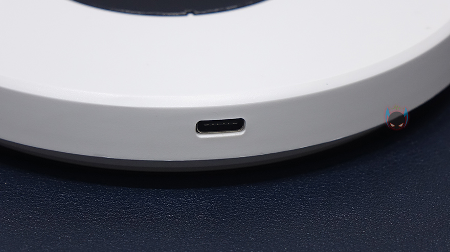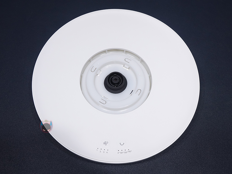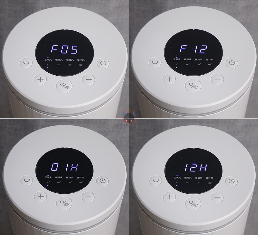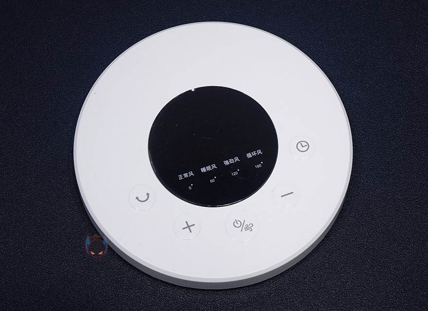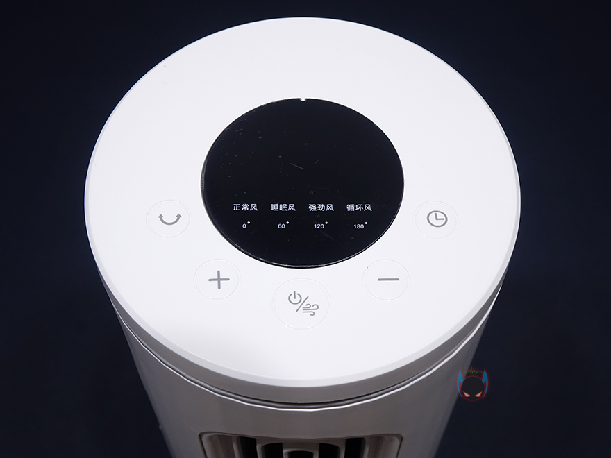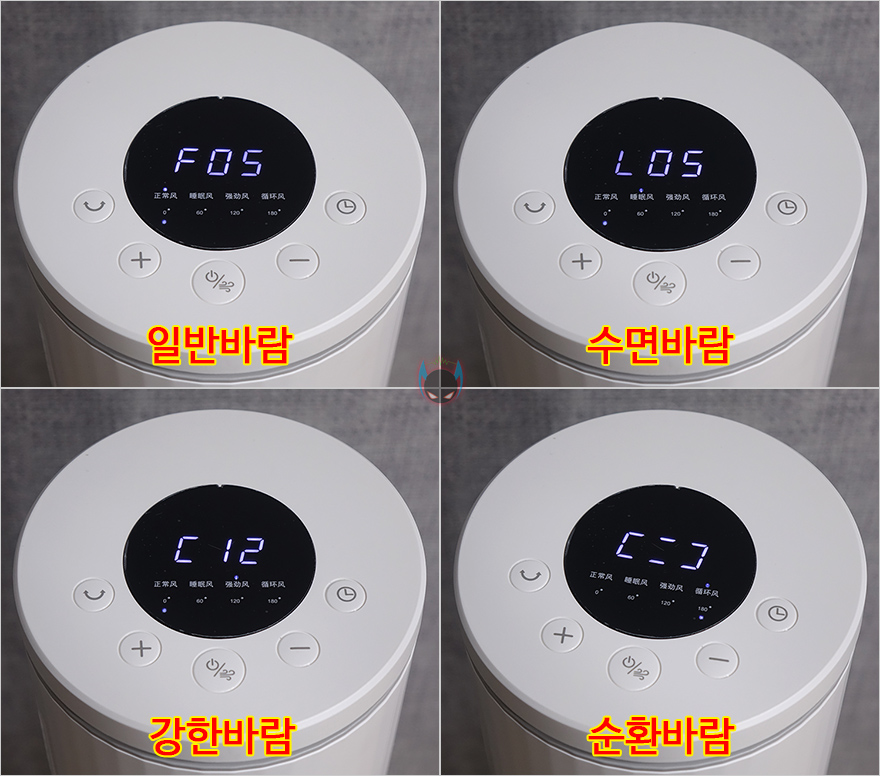마지막으로 무선 리모컨 같은경우에는 타워 팬 위에 올려놓을 수 있게 똑같은 지름 크기를 가졌으며, 충전해서 사용할 수 있게 뒷면에 USB Type-C 포트가 적용되어 있습니다. 터치 버튼들은 기능 표시를 해놨기 때문에 쉽게 알아볼 수 있는데, 왼쪽부터 회전, 바람세기 Up, 전원/바람모드, 바람세기 Down, 타이머 기능이죠. 그리고, 중심부에는 작동상태를 확인할 수 있는 LED 디스플레이가 적용되어 있는데, 표기된 숫자는 앞서 받침대에서 봤던 회전 각도 표시이며, 바로 위해 한자로 적힌 부분들은 바람모드로 왼쪽부터 일반바람/수면바람/강한바람/순환바람입니다.