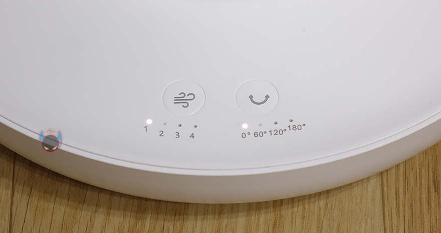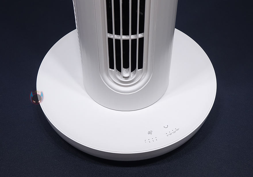 직접 Edon E360 타워형 선풍기를 사용해보면, 앞에서도 언급했듯이 사용 환경에 따라서 3단 높이로 사용할지, 2단 높이로 사용할지, 아니면 1단 높이로 사용할지 사용자가 선택할 수 있는데, 개인적으로 3단 높이는 에어컨과 함께 사용하면 효율이 좋고, 2단 높이는 앉아있을 때, 1단은 잠들 때 사용하면 적당한 높이라 생각됩니다. 실제로 사용해보니깐요. 그리고, 회전은 최대 180도까지 가능한데, 이는 팬 방향이 모두 똑같은 곳으로 일치했을 때이고, 앞서 언급했듯이 서로 다른 방향으로 나뉘어서 연결하면 180도 회전이라고 360도 방향으로 바람으로 보낼 수 있는거죠. 그리고, 받침대부분의 터치버튼 작동상태는 화이트 LED로 쉽게 확인할 수 있습니다.