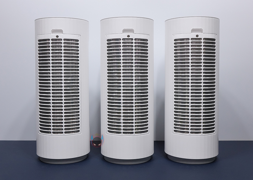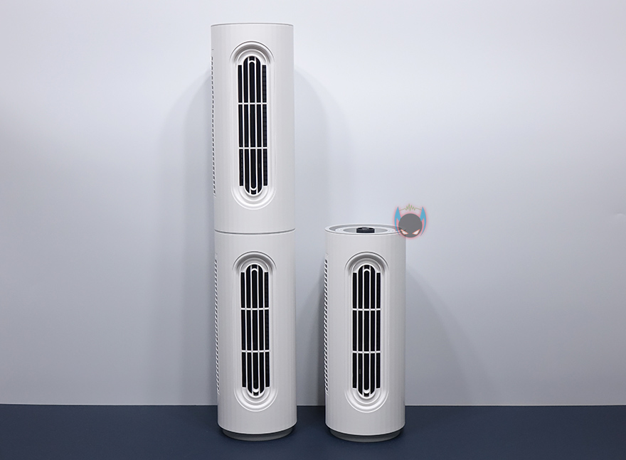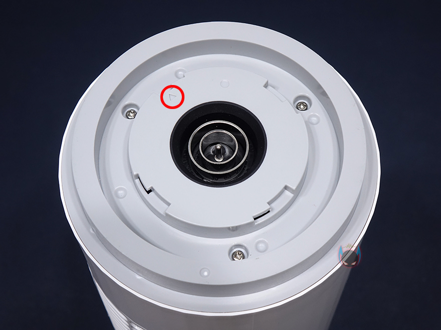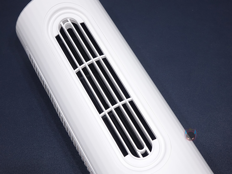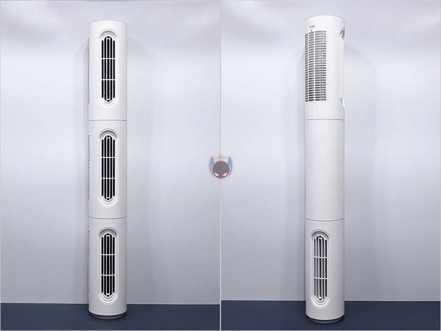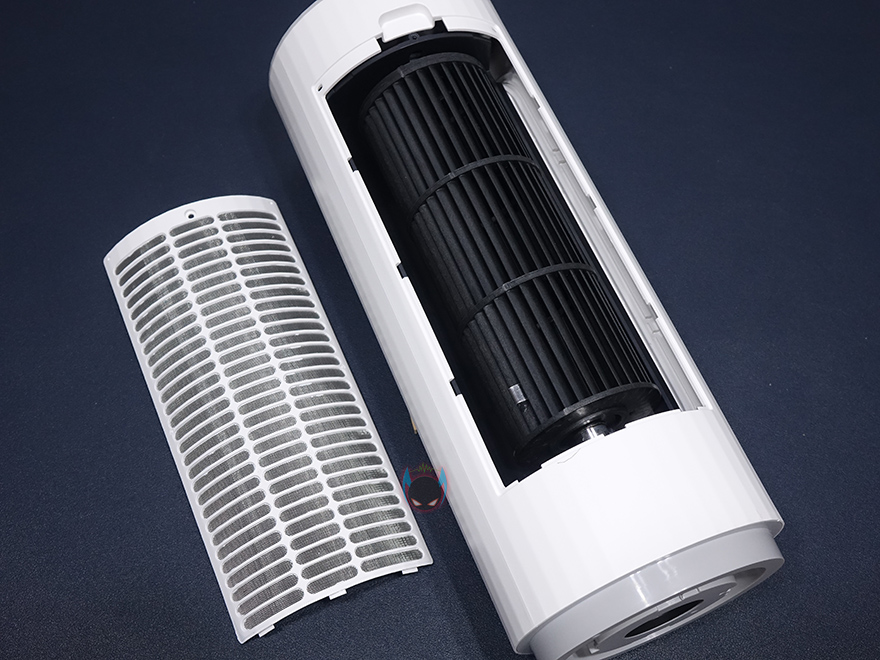 그럼, Edon E360 타워 선풍기를 살펴보는데, 먼저 3개로 분리되는 타워 팬부터 살펴보면, 각 팬마다 높이는 320mm이고, 지름은 130mm 입니다. 그리고, 바람이 나오는 전면에는 타원형 디자인의 에어홀을 볼 수 있으며, 반대편에는 필터가 장착된 것을 확인할 수 있죠. 필터는 윗부분에 나사를 풀면 쉽게 분리가 되고, 메탈재질이기 때문에 물세척으로 관리하면 됩니다. 그리고, 필터를 분리하면 내부에 장착된 타워형 날개를 확인할 수 있습니다.