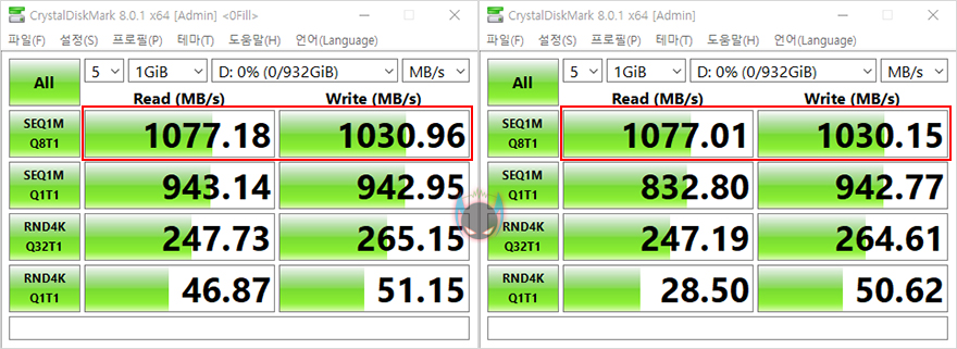 마지막으로 ACESO W10 USB 케이블은 USB 3.2 버전으로 데이터전송 최대 10Gbps라고 명시되어 있는데, 실제로 USB 3.2 Gen2x2까지 지원하는 외장 SSD에 연결해서 사용해 본 결과, 읽기와 쓰기속도 모두 케이블 스펙상에 맞게 1000MB/s까지 결과값이 나오는 것을 확인할 수 있습니다.