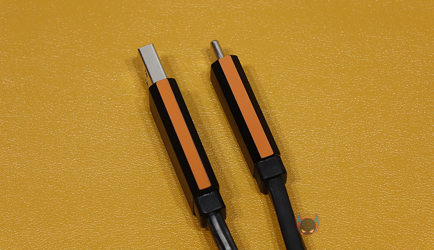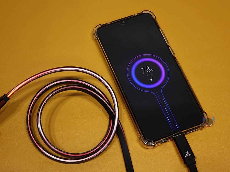 그럼, 실제로 VIVIFY ACESO W10 USB 케이블을 사용해봐야겠죠. 먼저, 기본적으로 전원어댑터에 연결했을 때 보면 바로, 케이블 측면으로 오렌지 색상의 라이팅효과를 볼 수 있습니다. 당연히 주변이 어두울수록 라이팅효과는 더 선명한데, 가장 밝은 곳은 USB Typa-A 인터페이스에 케이블이 시작되는 부분으로 LED 모듈이 적용된 부분이라 예상할 수 있겠습니다.