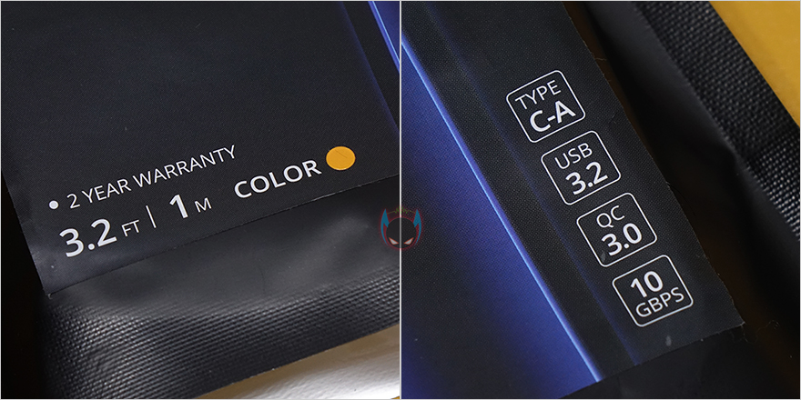 제품팩키지형태는 케이블이 액세서리 제품군에 속하기 때문에 흔히 볼 수 있는 지퍼-백 방식을 적용하고 있습니다. 그리고, 전면에는 모델명과 함께 제품 이미지를 미리 볼 수 있어 케이블형태를 짐작할 수 있는데, 바로, 케이블 측면으로 LED효과가 적용되어 있습니다. 뒤에서 작동되는 모습을 실제로 보겠지만, 이 LED에 따라 총 5가지 색상으로 나왔죠. 그리고, 케이블 인터페이스도 정확히는 USB Type-A에서 Type-C로 가는 방식입니다. 그러니깐 전원/충전어댑터에 USB Type-A가 연결되고 기기에 USB Type-C가 연결되는거죠. 이 밖에 케이블 길이와 LED 색상 구분 표기도 확인할 수 있고, 방금 언급했던 인터페이스와 USB 버전, 고속충전 버전, 10Gbps 대용량 지원표기도 확인할 수 있습니다.