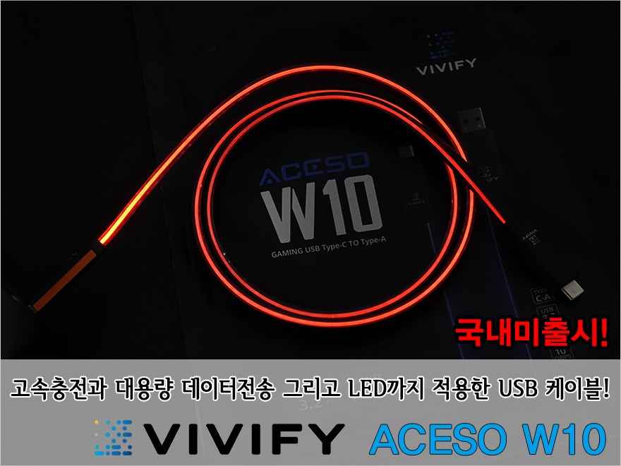 요즘 출시되는 스마트폰이나 노트북에선 대부분의 충전포트가 USB Type-C 포트죠. 이 USB Type-C 포트가 등장하면서 가장 큰 변화는 고속충전과 빠른 대용량 데이터 전송이라 할 수 있습니다. 그만큼 USB Type-C 포트의 활용이 기기 전반적으로 사용되고 있는데, 이런 USB Type-C 포트에 맞춰서 케이블시장도 현재 다양한 USB Type-C 케이블이 등장하고 있죠. 특히, 최근에 등장하는 USB Type-C 케이블 중에서는 충전상태를 보여주는 디스플레이 케이블과 시각적인 효과를 보여주는 LED가 케이블에 적용된 케이블이 있는데, 오늘 만나볼 제품은 후자에 속합니다. 바로, VIVIFY의 ACESO W10 USB 케이블이죠. 물론, 기존에도 LED가 적용된 케이블들은 존재했습니다. 하지만, 이 VIVIFY ACESO W10 케이블처럼 고속충전과 10Gbps 대용량 데이터전송까지 함께 갖춘 LED 케이블은 없었죠. 그럼, VIVIFY의 ACESO W10 USB 케이블을 한 번 살펴보도록 하겠습니다.