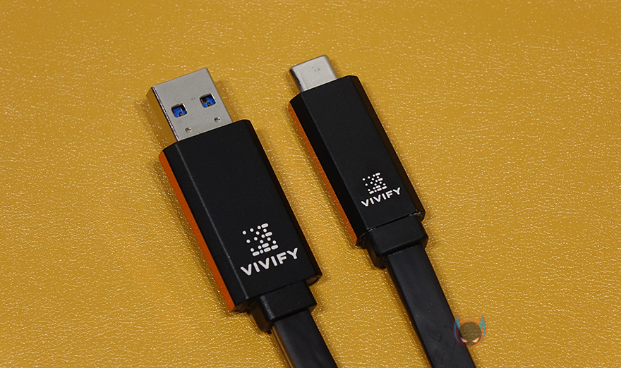 그럼, VIVIFY ACESO W10 USB 케이블을 살펴보면, 케이블 기본색상은 블랙색상이며, 가장 먼저 눈에 들어오는 부분은 바로 케이블의 굵기라할 수 있는데, 일반적인 원형 케이블이 아닌 플랫타입의 케이블로 약 4.5mm의 두꺼운 두께를 가졌습니다. 이는 LED가 적용되었기 때문이라 볼 수 있고, LED는 제품 이미지에서 확인했듯이, 측면에 케이블 길이와 동일하게 적용되어 있습니다. LED 색상은 제품사양 표기에서 확인했듯이 블루/그린/오렌지/퍼플/레드 총 5가지이며, 케이블 길이는 1m 입니다. 그리고 양쪽 USB Type-A와 Type-C 인터페이스부분에 모두 VIVIFY 로고를 새겨놨으며, 측면에 LED 색상 구분표시도 되어있죠.