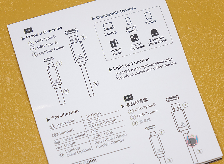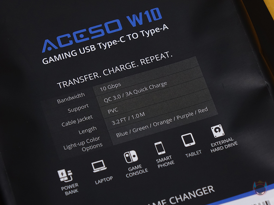 물론, 팩키지 후면에는 좀 더 자세하게 제품의 기본 사양을 표기해놨습니다. 방금 언급했던 라이팅색상 5가지 표기도 확인할 수 있고, 보조배터리를 비롯해 PC, 콘솔, 모바일기기, 외장 저장장치에 사용할 수 있다는 표기도 확인할 수 있죠. 지퍼-백을 열어보면 제품 그러니깐 ACESO W10 케이블은 흔들리지 않게 고정-틀에 포장되어 있으며, 제품구성은 간단하게 케이블과 제품설명서로 이루어져 있습니다. 설명서는 영어와 중국어 2가지로 표기되어 있습니다.