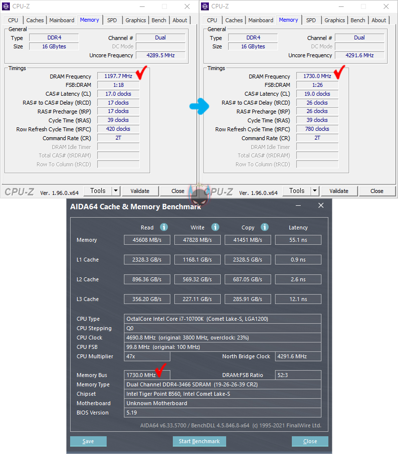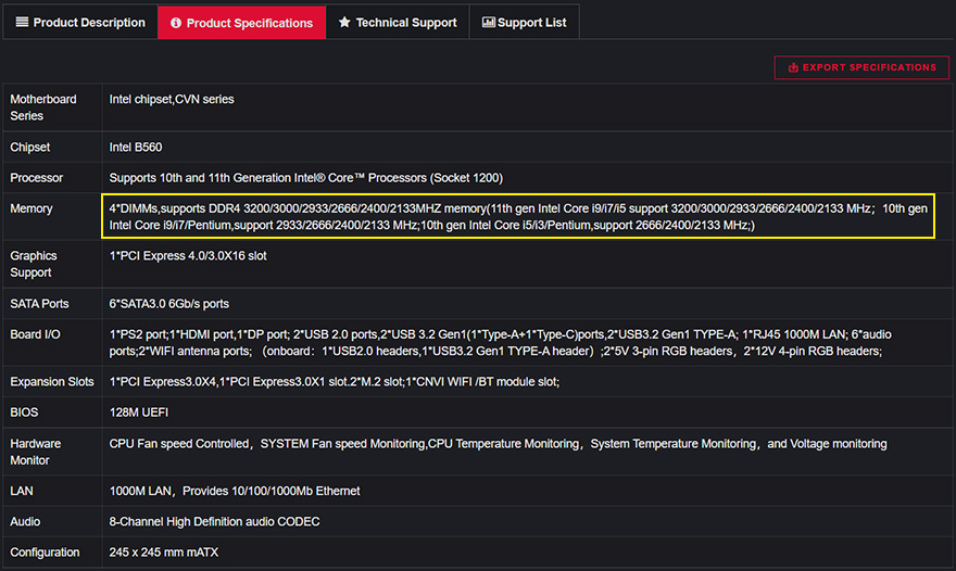 그리고, 시작에서 언급했듯이 B560 메인보드때부터는 메모리 오버클럭까지 가능해졌는데, 앞서 제품박스와 레이아웃에서 언급했듯이 컬러풀 CVN B560M GAMING FROZEN 메인보드는 사양표기에서 3200MHz까지만 지원표기를 해놨죠. 물론, 이것도 11세대 CPU를 사용했을때이고, 이전 10세대 CPU면 2933MHz까지라고 표기를 해놨는데, 이부분만 놓고보면 사실상 CVN B560M GAMING FROZEN 메인보드는 이전 CVN B460 메인보드와 마찬가지로 메모리 오버클럭 지원이 안된다고 볼 수 있습니다. 하지만, 실제로 확인해 본 결과, CVN B560M GAMING FROZEN 역시 다른 경쟁사들의 B560 메인보드와 마찬가지로 메모리 오버클럭이 적용되는 것을 확인할 수 있었습니다. 물론, 경쟁사들의 B560 메인보드에 비해서는 메모리 오버클럭이 높은 편은 아니였지만, 분명 CPU세대와 상관없이 그리고 제품사양에 표기된 클럭보다는 높게 적용되는 것을 확인할 수 있었기때문에 메모리 오버클럭이 지원된다 볼 수 있겠습니다.
