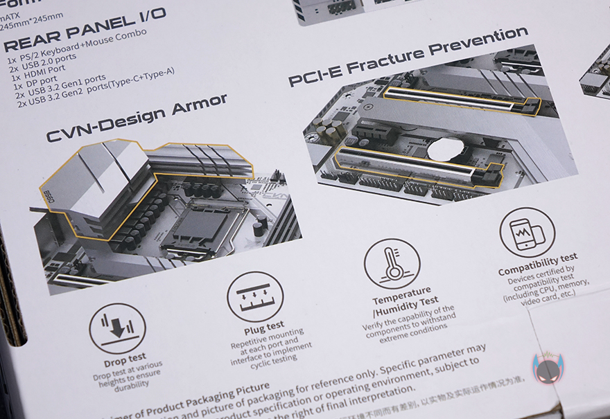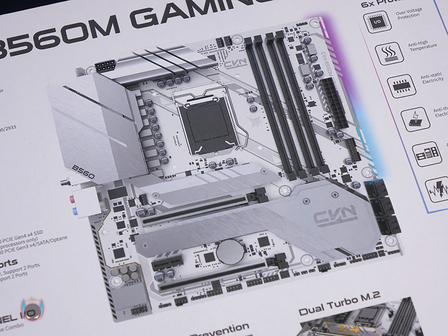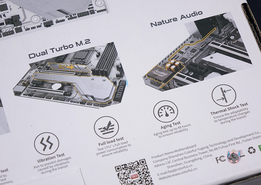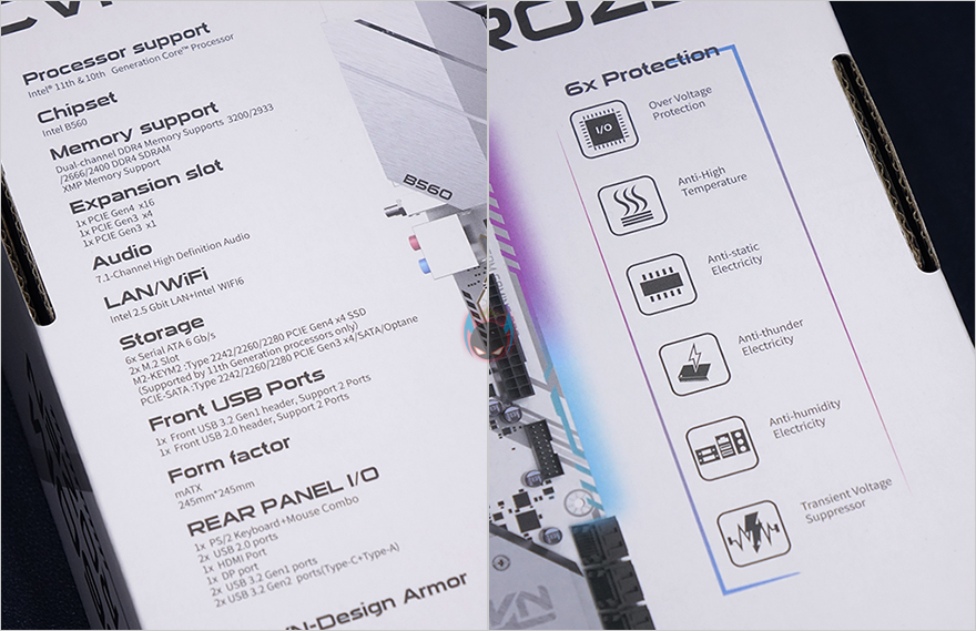 제품박스부터 살펴보면, 한눈에 봐도 이 제품이 화이트 컨셉이라는 것을 알 수 있게 화이트 색상 배경을 적용하고 있습니다. 그리고, 심플하게 전면에는 모델명과 인텔 칩셋 표시와 CPU 지원, 그리고 컬러풀의 RGB 라이팅효과 지원 표시를 확인할 수 있죠. 박스 후면에는 제품 풀-샷 이미지를 볼 수 있으며, 이미지 왼쪽에는 제품의 기본사양을 오른쪽에는 CVN 시리즈에서 늘 강조하는 6가지 보호기술(I/O 과전압보호/고발열보호/정전기보호/낙뢰보호/습기보호/전력과부하보호)을 표기해놨으며, 아래에는 전원부의 CVN 아머(Armor) 디자인 방열판, PCIe 슬롯 스틸 아머, 듀얼 M.2 슬롯, 독립PCB 내장오디오를 주요 특징으로 소개하고 있고, 아래에 제품 내구성 인증을 위한 극한 환경 테스트도 통과했음을 표기해놨습니다.