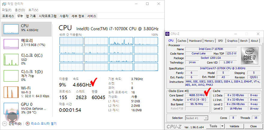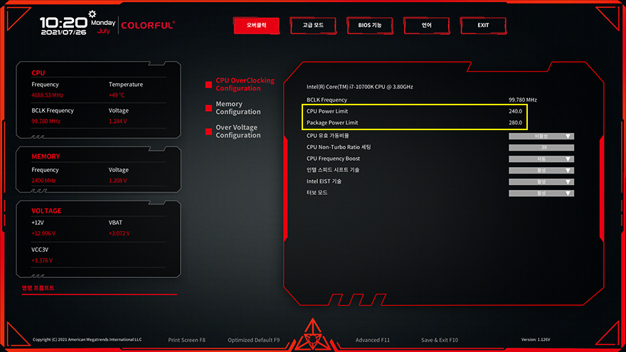 끝으로, 컬러풀 CVN B560M GAMING FROZEN은 B560 메인보드임으로 B560 메인보드의 주요 특징 지원에 대해서 알아보겠습니다. 가장 먼저 B460 메인보드때부터 지원되기 시작한 전력해제 같은경우, 컬러풀 CVN B560M GAMING FROZEN 메인보드에선 이전 CVN B460 메인보드때와 마찬가지로 CMOS에서 별도의 전력해제 설정메뉴가 없습니다. 대신에 오버클럭 메뉴로 들어가보면 CPU와 전원부의 Power Limit이 이미 해제된 상태인 것을 확인할 수 있죠. 다시 말해, CVN B560M GAMING FROZEN 역시 이전 CVN B460 메인보드때와 마찬가지로 CPU를 장착하면 알아서 전력해제가 된 상태에서 작동이 된다라는 것입니다. 앞서 다른 B460과 B560 메인보드에서 확인했듯이 i7-10700/10700K CPU를 전력해제로 사용하면 4.7GHz로 작동되는데, 컬러풀 CVN B560M GAMING FROZEN 메인보드에서도 장착한 후 확인해 본 결과 별도의 전력해제 없이 4.7GHz로 작동되는 것을 확인할 수 있었죠. 즉, 소비자입장에서 보면 따로 CMOS 메뉴까지 들어가서 설정할 필요없이 바로 적용되어서 사용할 수 있기때문에 편리하다할 수 있습니다.