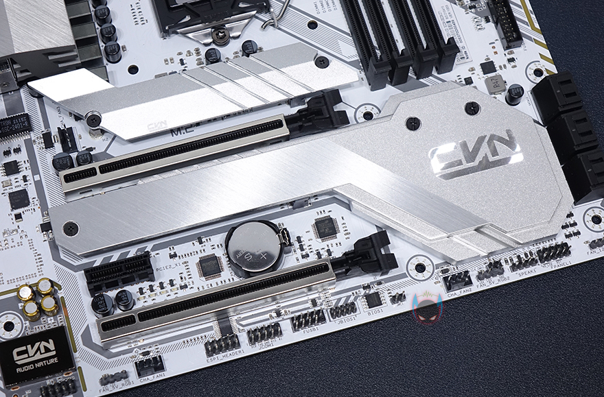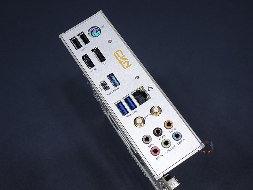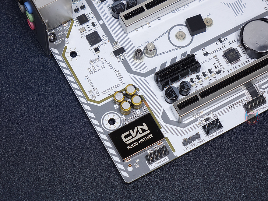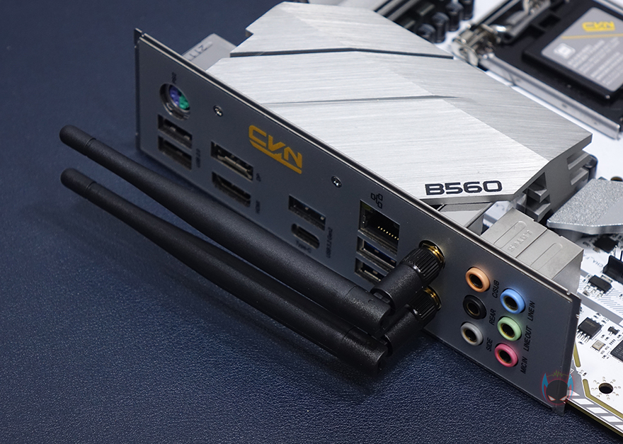 메인보드 맨 왼쪽에는 독립된 PCB구간으로 내장 오디오를 적용하고 있으며, 오디오 칩셋부분에는 고주파음 최소화를 위해 EMI쉴드까지 적용했고, 메인 캐패시터도 일본 니치콘 브랜드를 사용했으며, 주변에 5V ARGB 헤더가 배치된 것을 확인할 수 있습니다. 그래서, RGB 헤더는 12V 2개, 5V 2개로 총 4개가 지원되고 있죠. 끝으로, 백패널 I/O 부분을 살펴보면, 요즘 메인보드답게 쉴드도 함께 장착되어 있으며, 쉴드부분에 각 포트별로 명칭까지 표시해놔서 쉽게 구분을 할 수 있습니다. PS/2 포트를 비롯해 USB 2.0 포트 2개, USB 3.2 Gen2 포트 2개, USB 3.2 Gen1 포트 2개, 모니터 출력포트에 HDMI와 DP 포트, 2.5Gbps 기가 랜포트, 무선 와이파이6 모듈, 오디오 포트 구성을 확인할 수 있으며, 무선 와이파이6 모듈에는 앞서 구성품에서 확인한 안테나 2개를 장착해서 사용하면 됩니다. 참고로, 무선 와이파이6 모듈은 CVN B560M GAMING FROZEN 모델 그러니깐 화이트색상 모델에만 적용되었고, 기본 블랙색상의 CVN B560M GAMING에는 적용되어 있지 않습니다.(CVN Z590 메인보드도 동일)