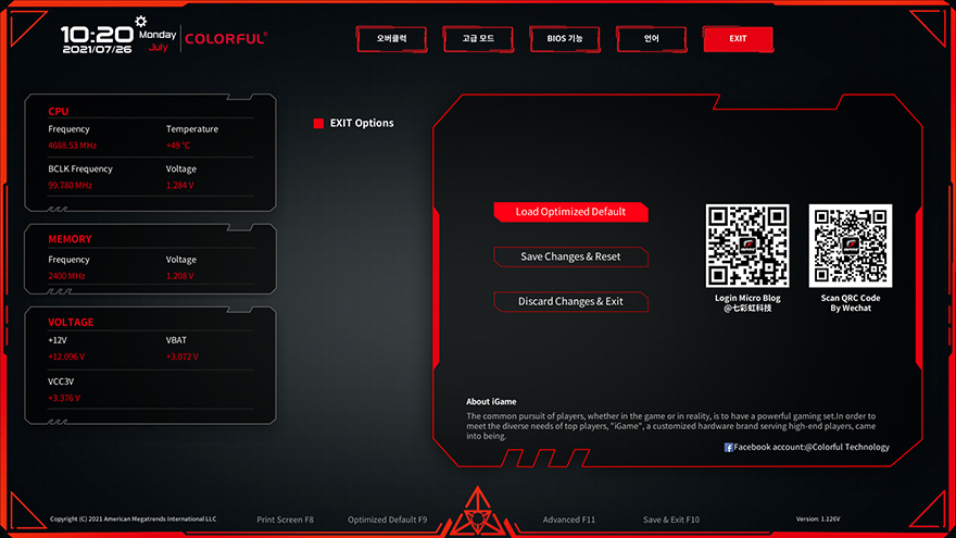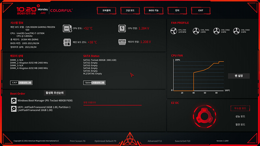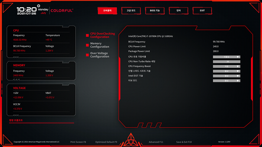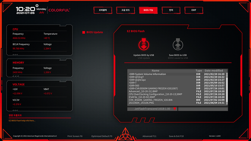 그리고, CVN B560M GAMING FROZEN 메인보드의 CMOS 인터페이스와 메뉴 역시 이전 CVN B460 메인보드와 동일합니다. 메뉴는 크게 오버클럭, 고급모드, 바이오스 기능, 언어, 종료이며, 메인화면에선 전체적인 시스템 모니터링 화면을 보여주고, 언어부분은 당연히 한국어도 지원해주고 있습니다.