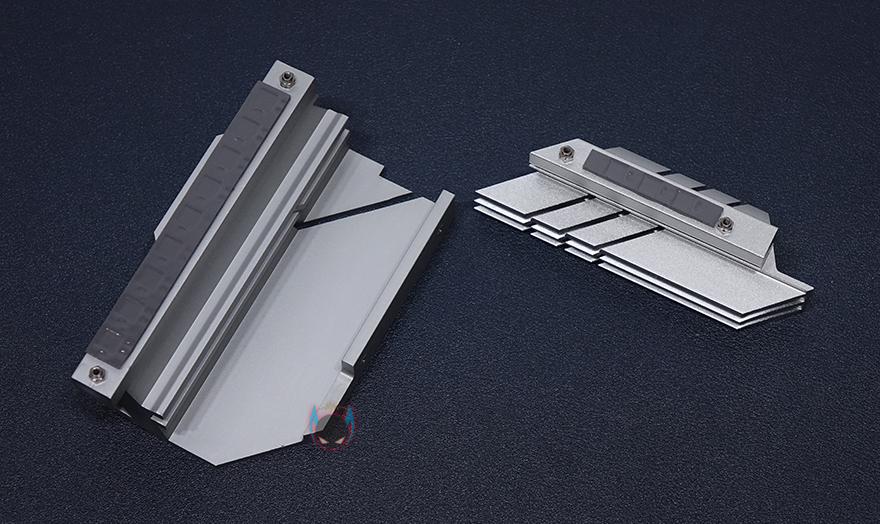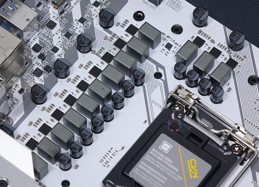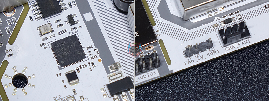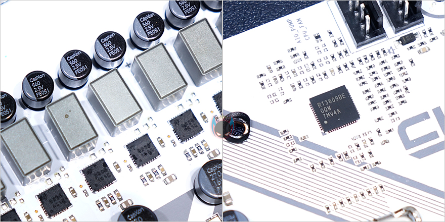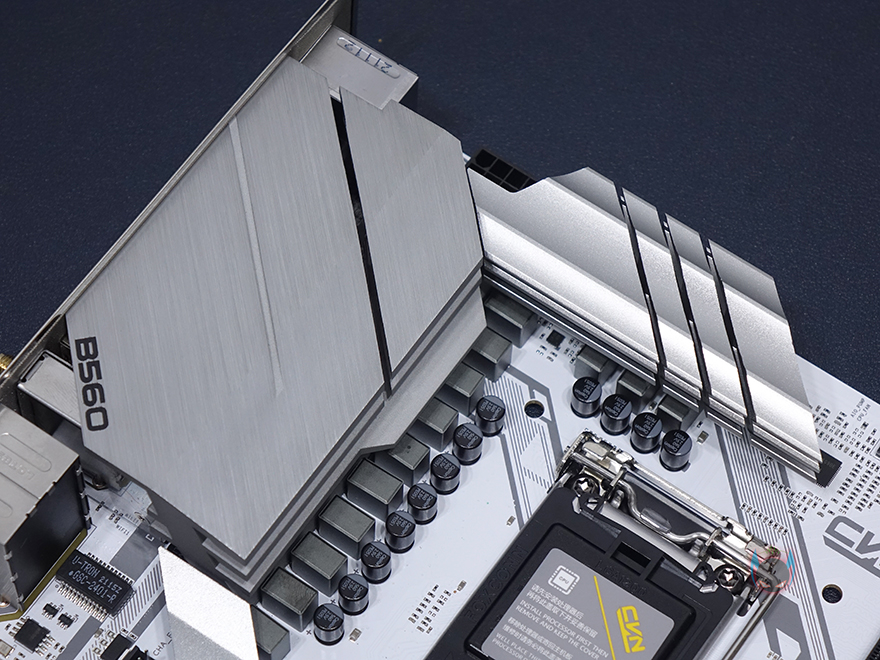좀 더 자세히 부위별로 레이아웃을 살펴보면, 전원부쪽에는 화이트색상 컨셉에 맞춰서 실버색상의 대형 히트싱크가 장착되어 있는데, 최근 이런 대형 히트싱크를 적용해 일명 아머(Armor) 디자인이라 많이 부르고 있죠. 히트싱크를 분리해보면 둘 다 기본적으로 전원스 모스펫의 발열을 해결할 수 있게 써멀패드가 부착되어 있습니다. 전원부는 총 12페이즈 구성을 하고 있으며, 모스펫은 Dr.MOS로 디지털 전원부입니다. 전원 캐패시터나 전원 컨트롤 칩셋이 같은 CVN 시리즈로 나왔던 이전 세대 B460 메인보드와 동일하기 때문에, 사실상 전원부 페이즈 수만 늘어났다고 보면 되는데, 이는 다른 경쟁사 제품들도 마찬가지죠.