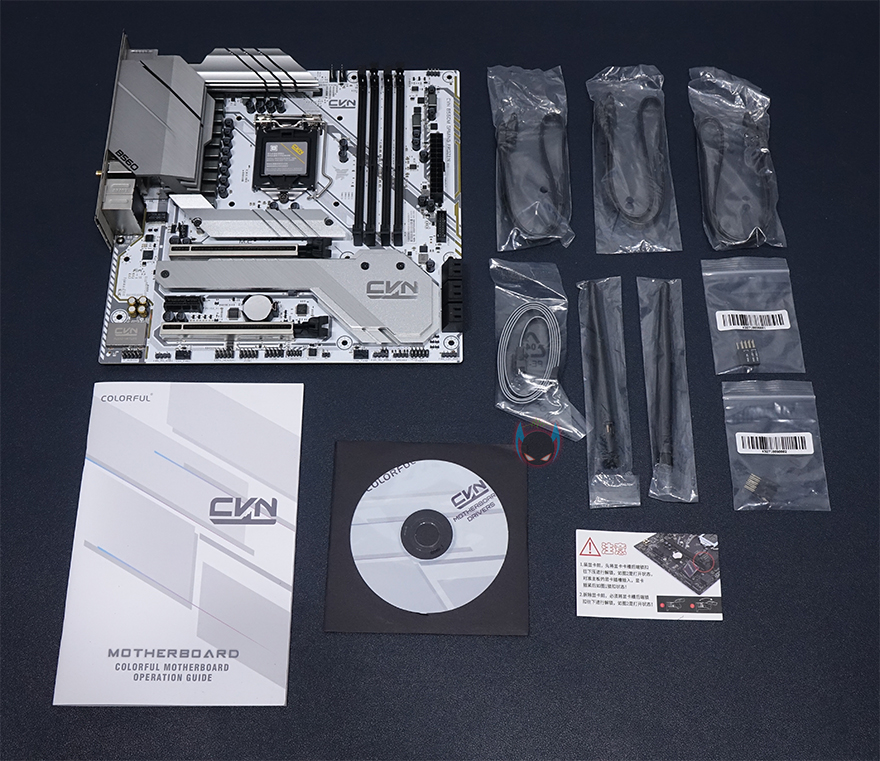 제품박스를 열어보면, CVN B560M GAMING FROZEN 메인보드는 정전기방지 보호비닐에 기본 포장되어 있으며, 메인보드를 비롯해 제품구성에는 SATA 케이블 6개, 5V ARGB 연장케이블, 무선 안테나, 퀵-커넥터 2개, 제품설명서, 드라이버CD로 구성되어 있습니다. 국내에서 컬러풀 메인보드 제품이 경쟁사들보다 조금 더 저렴한 편임을 감안하면 제품 구성이 나쁘지 않다라는 것을 알 수 있죠. 뒤에서 확인하겠지만, 무선 와이파이6 모듈까지 기본으로 갖추고 있으니깐요.