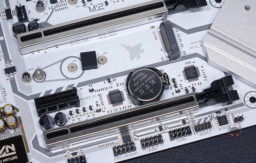 이번엔 M.2 SSD 슬롯을 확인해보는데, M.2 SSD 슬롯은 2개 배치로 모두 발열해결을 위해 히트싱크가 적용되었습니다. 물론, 안쪽에 써멀패드도 기본 부착되어 있죠. 2개의 M.2 슬롯 모두 SSD 2280 사리즈까지 장착이 가능하며, 윗부분에 M.2 슬롯이 2번이고, 아래에 위치한 슬롯이 M.2 1번 슬롯으로 1번 슬롯은 인텔 11세대 CPU 사용시 PCIe 4.0x4까지 지원해 최대 7,000MB/s까지 작동합니다. 그리고, M.2 슬롯 사이마다 배치된 PCI 슬롯 중 그래픽카드를 장착할 수 있는 PICe x16과 x4 슬롯은 내구성 강화를 위해 스틸 아머를 적용했습니다.