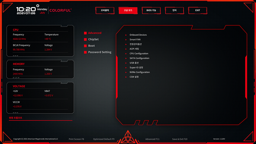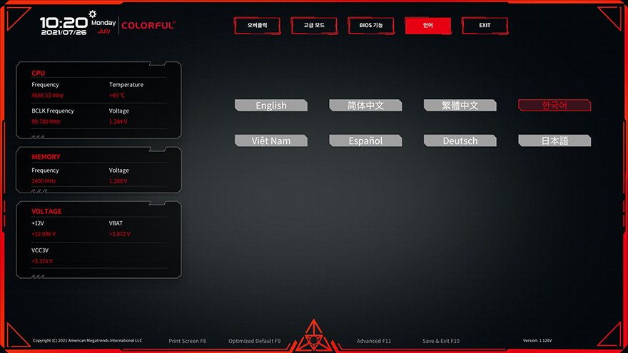 그리고, CVN B560M GAMING FROZEN 메인보드의 CMOS 인터페이스와 메뉴 역시 이전 CVN B460 메인보드와 동일합니다. 메뉴는 크게 오버클럭, 고급모드, 바이오스 기능, 언어, 종료이며, 메인화면에선 전체적인 시스템 모니터링 화면을 보여주고, 언어부분은 당연히 한국어도 지원해주고 있습니다.