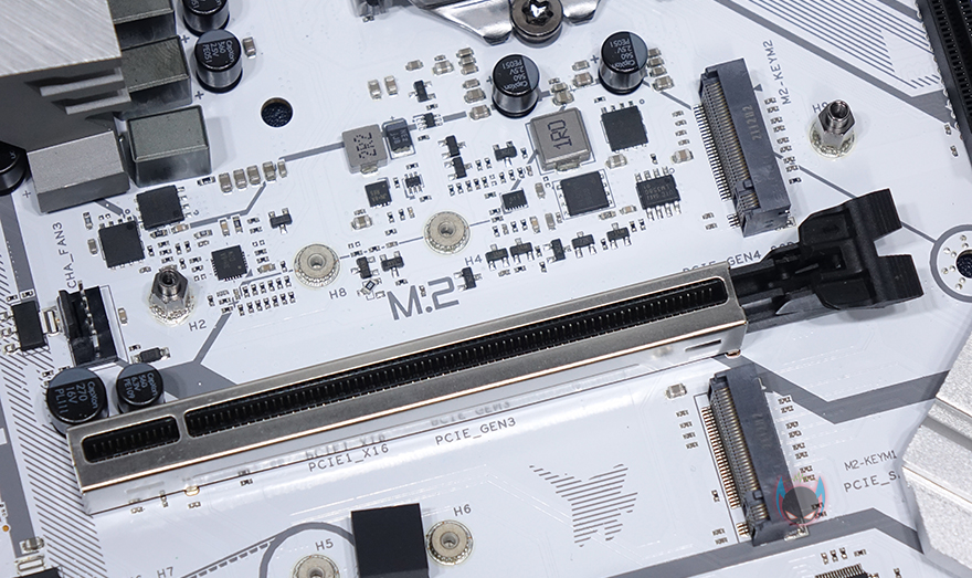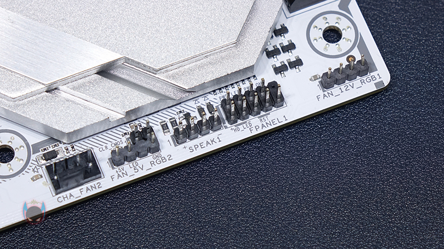 좀 더 자세히 부위별로 레이아웃을 살펴보면, 전원부쪽에는 화이트색상 컨셉에 맞춰서 실버색상의 대형 히트싱크가 장착되어 있는데, 최근 이런 대형 히트싱크를 적용해 일명 아머(Armor) 디자인이라 많이 부르고 있죠. 히트싱크를 분리해보면 둘 다 기본적으로 전원스 모스펫의 발열을 해결할 수 있게 써멀패드가 부착되어 있습니다. 전원부는 총 12페이즈 구성을 하고 있으며, 모스펫은 Dr.MOS로 디지털 전원부입니다. 전원 캐패시터나 전원 컨트롤 칩셋이 같은 CVN 시리즈로 나왔던 이전 세대 B460 메인보드와 동일하기 때문에, 사실상 전원부 페이즈 수만 늘어났다고 보면 되는데, 이는 다른 경쟁사 제품들도 마찬가지죠.