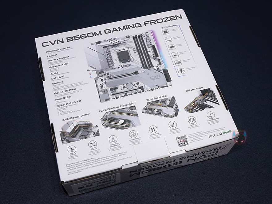 제품박스부터 살펴보면, 한눈에 봐도 이 제품이 화이트 컨셉이라는 것을 알 수 있게 화이트 색상 배경을 적용하고 있습니다. 그리고, 심플하게 전면에는 모델명과 인텔 칩셋 표시와 CPU 지원, 그리고 컬러풀의 RGB 라이팅효과 지원 표시를 확인할 수 있죠. 박스 후면에는 제품 풀-샷 이미지를 볼 수 있으며, 이미지 왼쪽에는 제품의 기본사양을 오른쪽에는 CVN 시리즈에서 늘 강조하는 6가지 보호기술(I/O 과전압보호/고발열보호/정전기보호/낙뢰보호/습기보호/전력과부하보호)을 표기해놨으며, 아래에는 전원부의 CVN 아머(Armor) 디자인 방열판, PCIe 슬롯 스틸 아머, 듀얼 M.2 슬롯, 독립PCB 내장오디오를 주요 특징으로 소개하고 있고, 아래에 제품 내구성 인증을 위한 극한 환경 테스트도 통과했음을 표기해놨습니다.