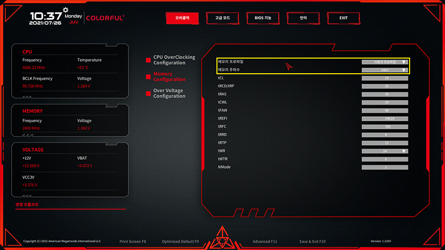 그리고, 시작에서 언급했듯이 B560 메인보드때부터는 메모리 오버클럭까지 가능해졌는데, 앞서 제품박스와 레이아웃에서 언급했듯이 컬러풀 CVN B560M GAMING FROZEN 메인보드는 사양표기에서 3200MHz까지만 지원표기를 해놨죠. 물론, 이것도 11세대 CPU를 사용했을때이고, 이전 10세대 CPU면 2933MHz까지라고 표기를 해놨는데, 이부분만 놓고보면 사실상 CVN B560M GAMING FROZEN 메인보드는 이전 CVN B460 메인보드와 마찬가지로 메모리 오버클럭 지원이 안된다고 볼 수 있습니다. 하지만, 실제로 확인해 본 결과, CVN B560M GAMING FROZEN 역시 다른 경쟁사들의 B560 메인보드와 마찬가지로 메모리 오버클럭이 적용되는 것을 확인할 수 있었습니다. 물론, 경쟁사들의 B560 메인보드에 비해서는 메모리 오버클럭이 높은 편은 아니였지만, 분명 CPU세대와 상관없이 그리고 제품사양에 표기된 클럭보다는 높게 적용되는 것을 확인할 수 있었기때문에 메모리 오버클럭이 지원된다 볼 수 있겠습니다.