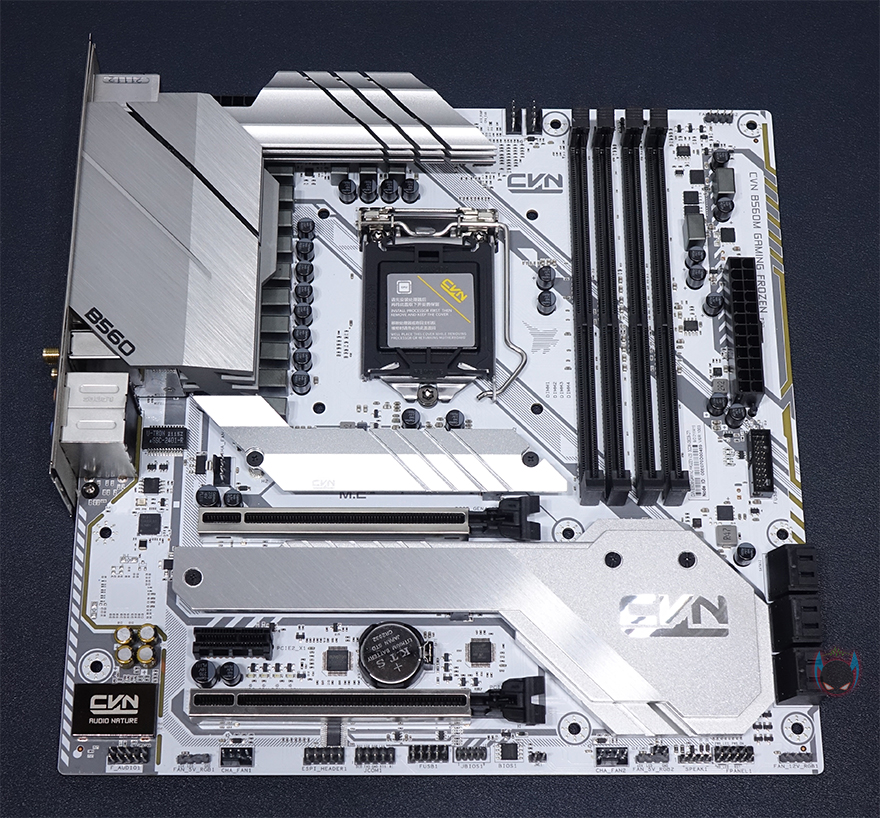 메인보드 맨 왼쪽에는 독립된 PCB구간으로 내장 오디오를 적용하고 있으며, 오디오 칩셋부분에는 고주파음 최소화를 위해 EMI쉴드까지 적용했고, 메인 캐패시터도 일본 니치콘 브랜드를 사용했으며, 주변에 5V ARGB 헤더가 배치된 것을 확인할 수 있습니다. 그래서, RGB 헤더는 12V 2개, 5V 2개로 총 4개가 지원되고 있죠. 끝으로, 백패널 I/O 부분을 살펴보면, 요즘 메인보드답게 쉴드도 함께 장착되어 있으며, 쉴드부분에 각 포트별로 명칭까지 표시해놔서 쉽게 구분을 할 수 있습니다. PS/2 포트를 비롯해 USB 2.0 포트 2개, USB 3.2 Gen2 포트 2개, USB 3.2 Gen1 포트 2개, 모니터 출력포트에 HDMI와 DP 포트, 2.5Gbps 기가 랜포트, 무선 와이파이6 모듈, 오디오 포트 구성을 확인할 수 있으며, 무선 와이파이6 모듈에는 앞서 구성품에서 확인한 안테나 2개를 장착해서 사용하면 됩니다. 참고로, 무선 와이파이6 모듈은 CVN B560M GAMING FROZEN 모델 그러니깐 화이트색상 모델에만 적용되었고, 기본 블랙색상의 CVN B560M GAMING에는 적용되어 있지 않습니다.(CVN Z590 메인보드도 동일)