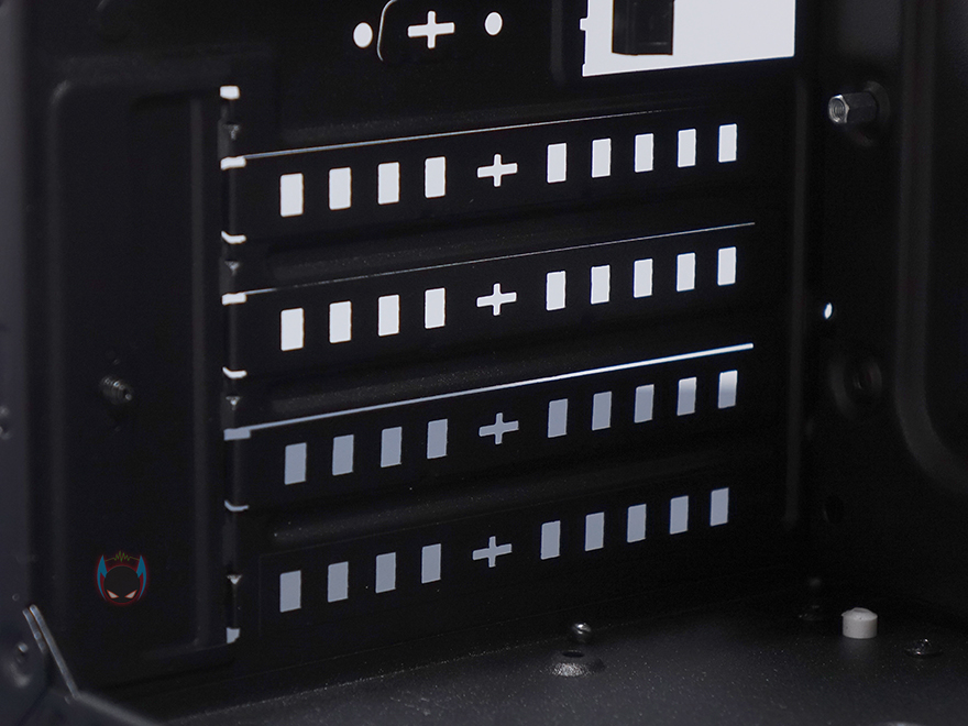 이 외에 내부 전면부에는 윗부분에 외부 ODD 장착을 위한 5.25인치 베이가 적용되어 있으며, 바로 아래에 3.5인치 HDD도 장착할 수 있고, 또 그아래에는 2.5인치 저장장치를 장착할 수 있죠. 내부 전면에는 전면 쿨링효과를 높일 수 있게 120mm 팬을 장착할 수 있게 지원하고 있는데, 최대 2개까지 장착이 가능하지만, 맨 아랫부분은 전면이 막혀있기때문에 사실상 중간위치에 팬만 장착해도 효과를 비슷하다 할 수 있습니다. 그리고, 후면에는 앞서 외부에서 미리 확인한 80mm 팬이 장착된 것을 확인할 수 있고, PCI슬롯 가이드는 일회용으로 적용되었습니다.