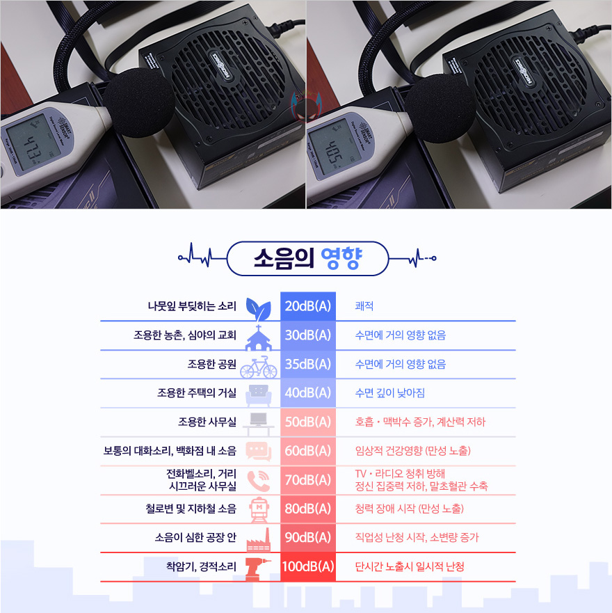 끝으로, Idle과 Load 진행 상황에서 클래식2 풀-체인지 600W 파워서플라이 팬 소음을 측정해봤는데, 이 제품 같은경우 파워서플라이의 내부 온도가 어느정도 도달했을 때 팬이 작동하기 때문에 Idle에선 사실상 팬리스 모드로 무소음입니다. 그리고, Load 상황에선 진행동안 최대 47dB(A)로 작동했으며, Load 진행 후 발열해결로 팬이 계속 작동되는데, 온도가 점점 낮아지면 팬 속도도 자동으로 줄어들어 소음이 낮아지는 것을 확인할 수 있었습니다. 팬리스의 무소음부터 과부하의 소음까지 50dB(A)을 넘지 않기때문에, 사실상 PC케이스 내부에 장착해서 사용하면 더 작게 들려서 소음에 대해선 민감하게 반응할 필요는 없을 것 같습니다. 그리고, PC전원을 끄면, 파워서플라이의 잔열 해결을 위한 팬 작동의 마이크로닉스 애프터쿨링이 적용되어서 제품 수명유지에도 도움이 되겠습니다.