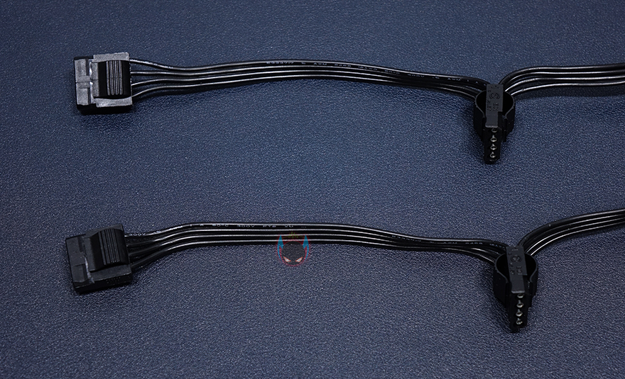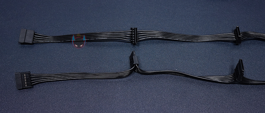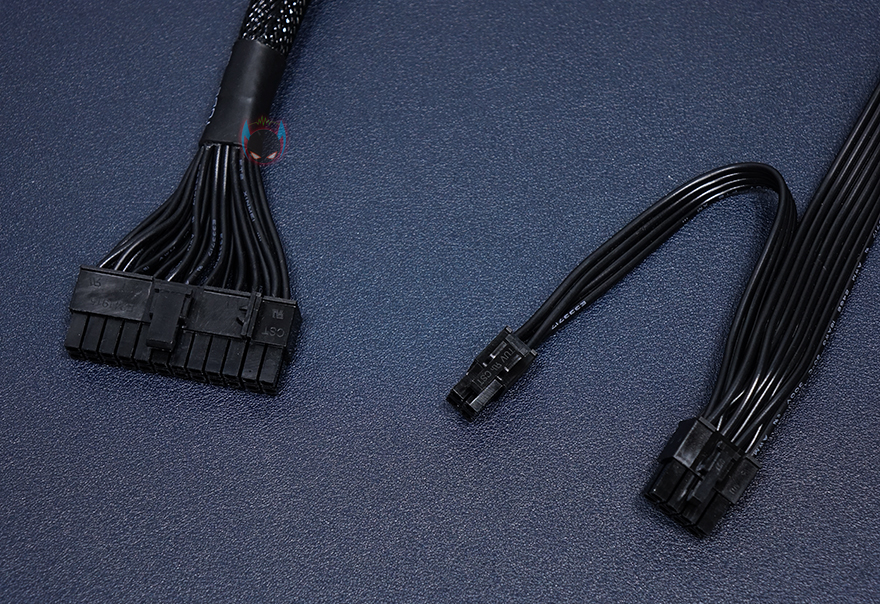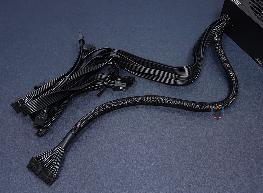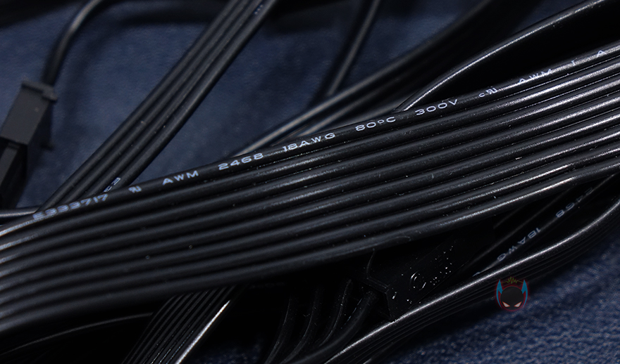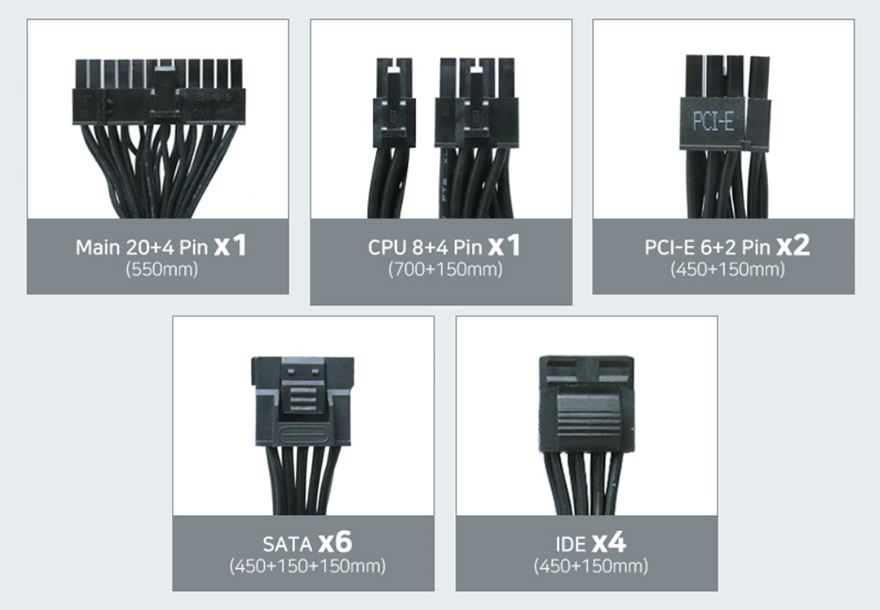 케이블은 메인보드 24핀 케이블은 기본적인 슬리빙처리 케이블이고, 나머지 케이블들은 플랫(Flat)타입 케이블로 적용되었습니다. 색상은 모두 블랙색상으로 통일했으며, 길이는 요즘 PC케이스 그러니깐 하단에 장착되는 구조를 고려해 전반적으로 넉넉한 길이를 가졌습니다. 실제로 PC케이스와 함께 시스템 조립을 해봤을 때도 케이블 길이에 대한 부족함은 없었습니다. 케이블 AWG 규격 또한 인텔 파워서플라이 가이드라인에 맞춘 표준 18 AWG를 사용했습니다. 커네턱 구성은 메인보드 24(20+4)핀을 비롯해 보조전원 ATX 8핀과 4핀 각각 1개씩을 구성하고 있어 최신 메인보드에도 적합하도록 했으며, PCI-E 8(6+2)핀 2개, S-ATA 6개, P-ATA 4개로 구성되어 있습니다. 전반적으로 커넥터 구성은 부족하거나 많다라는 느낌없이 적정 수량을 가졌다 할 수 있습니다.