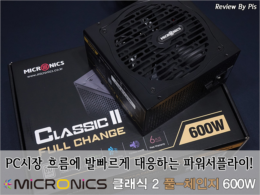 예전에는 조립PC를 구상할 때 대중적으로 파워용량을 500W로 많이 선택했습니다. 하지만, 최근에는 600W이상으로 선택하는 경우가 많아졌죠. 이는 PC시장에 몇 가지 변화가 있기때문인데, 가장 큰 변화는 대중적으로 선택하는 메인스트림급의 CPU와 그래픽카드 제품들의 성능이 높아졌고, 메인보드시장도 보조전원이 2개로 늘어난 제품들이 많아졌기 때문입니다. 특히, 메인보드 같은경우 방금 언급했듯이 보조전원 ATX 지원이 8핀과 4핀으로 지원되는경우가 많아졌기 때문에, 이를 지원하는 케이블구성으로 최소 600W 파워서플라이 제품은 선택을 해야하는 상황이죠. 여기서 최소 600W를 선택해야한다라는 것은 최신 제품을 의미하기도 합니다. 출시된지 2년이상 된 600W 제품들에선 보조전원 ATX 8핀과 4핀이 없는 경우도 많으니깐요. 국내 파워서플라이 1위 브랜드라 할 수 있는 마이크로닉스에선 이런 시장 변화에 맞춰 가장 최신 600W 파워서플라이 제품을 선보였는데, 바로, 클래식2 풀-체인지 모델입니다. 그럼, 마이크로닉스의 클래식2 풀-체인지 600W 파워서플라이를 한 번 살펴보도록 하죠.