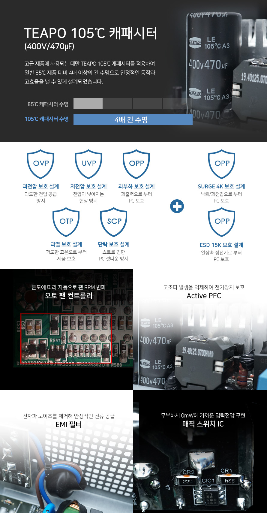 마이크로닉스 클래식2 풀-체인지 600W 파워서플라이 내부는 보증씰이 부착되어 있어서 따로 내부를 분해서 볼 수 없지만, 요즘은 대부분 파워서플라이 제품들이 내부를 상품소개에 투명하게 공개하는 편이죠. 마이크로닉스 역시 클래식2 풀-체인지 600W 내부 정보를 상품 상세페이지로 투명하게 공개하고 있는데, 메인 캐패시터는 대만 TEAPO사 제품을 사용했으며 보호회로는 총 7가지 적용하고 있습니다. 특히, 보호회로 같은경우 과부하의 OPP 뿐만 아니라 낙뢰와 정전기로도 보호할 수 있게 서지 4K와 ESD 15K OPP까지 적용하고 있죠. 이외에도 애프터쿨링을 지원하기 때문에 오토 팬 컨트롤러가 적용되어 있으며, 전력효율을 위한 액티브PFC, 고주파음 최소화의 EMI필터, 무부하시 0mW 구현을 위한 스위치 IC도 적용하고 있습니다. 전반적으로 기존 클래식2보다 안정성을 더 강화했다라는 것을 짐작할 수 있죠.