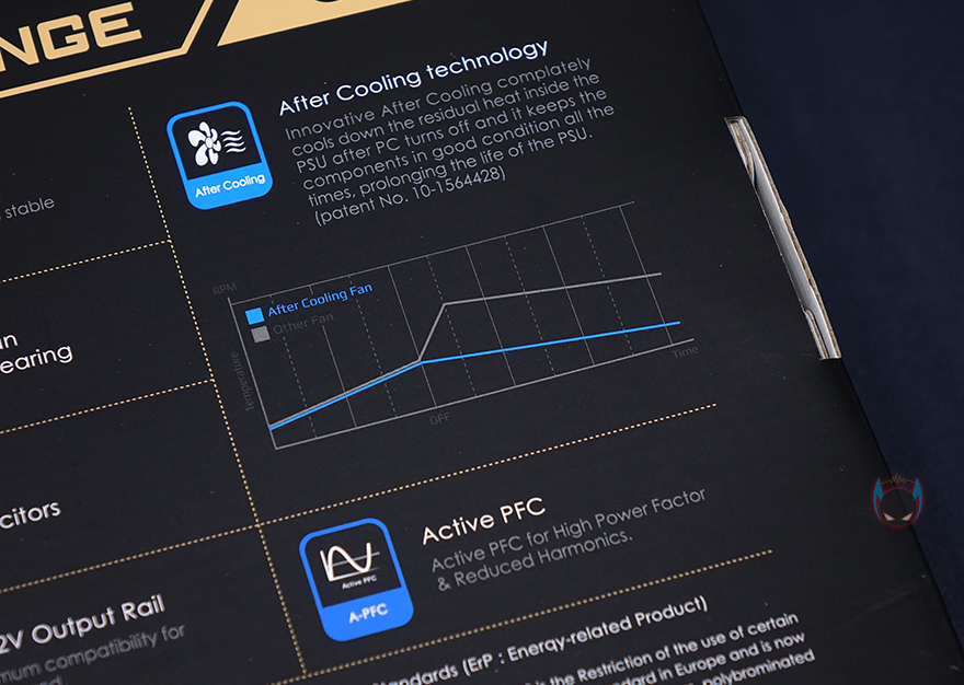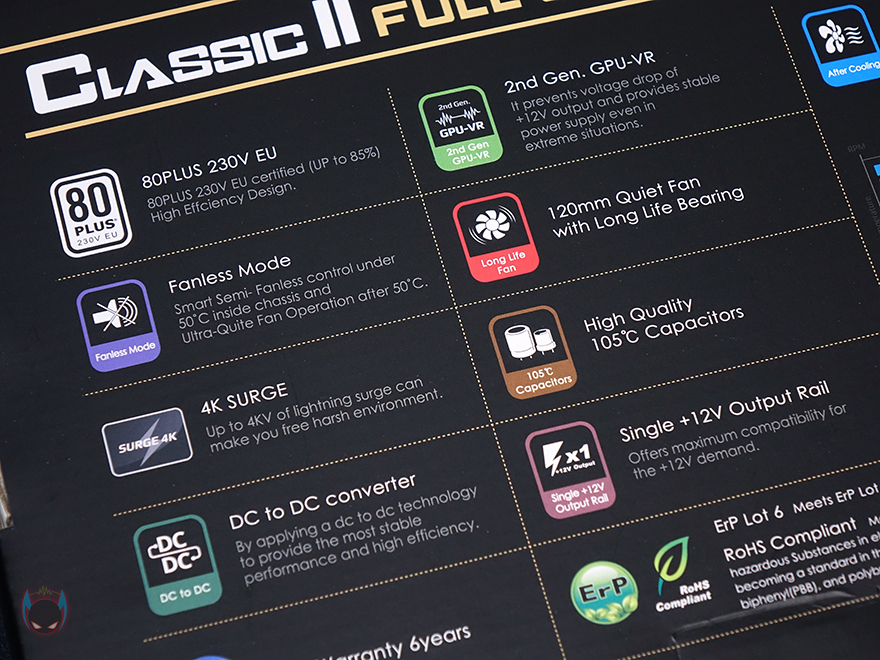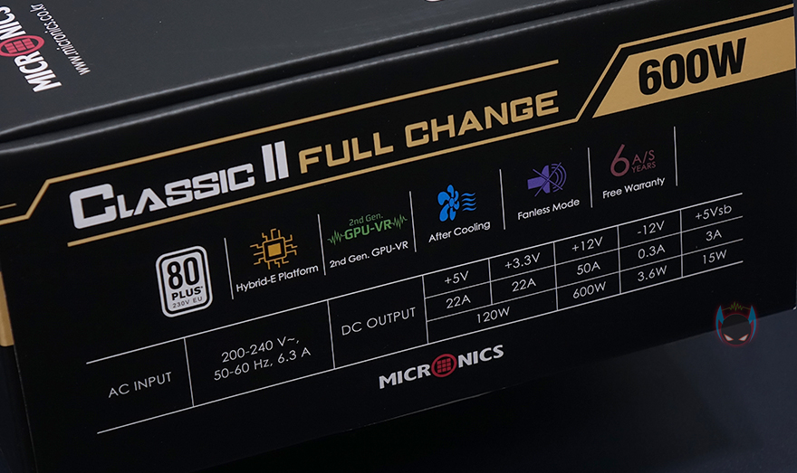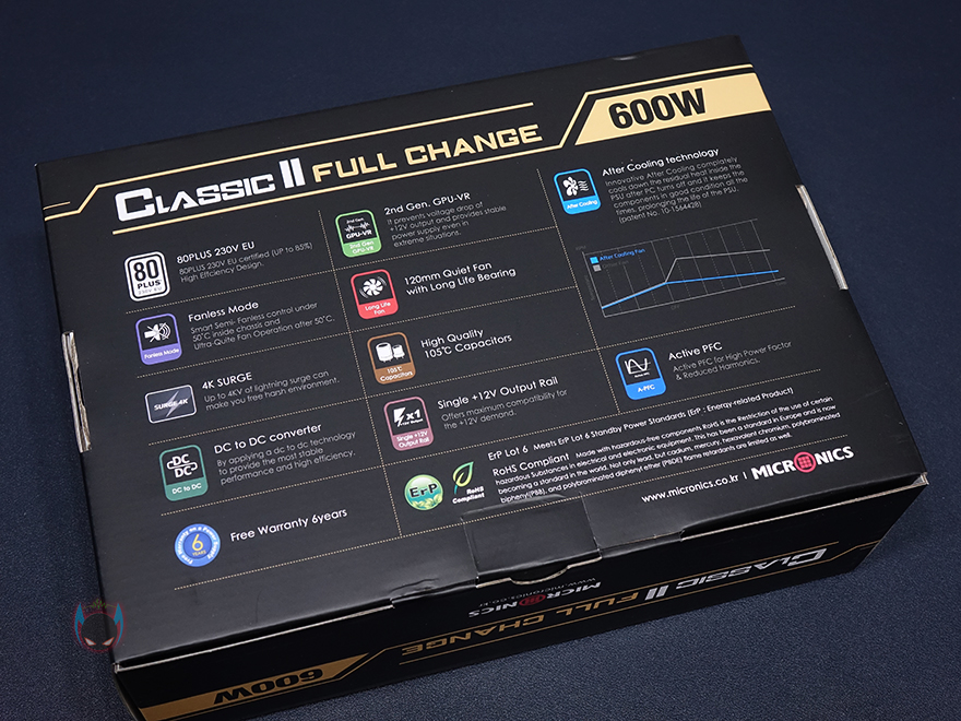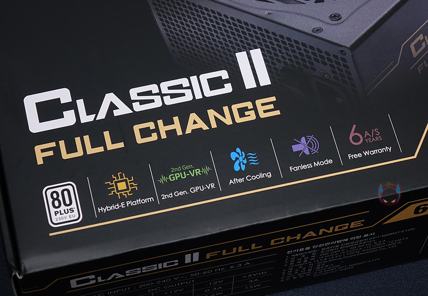 제품박스부터 살펴보면, 마이크로닉스의 기본 클래식2 파워서플라이를 이미 알고 있는 소비자라면 박스에 담긴 제품 이미지만 봤을 때 변화가 있다라는 것을 짐작할 수 있습니다. 디자인에 변화가 생긴거죠. 그리고, 모델명을 비롯해 80 Plus 스탠다드 인증과 2세대 GPU-VR, 애프터 쿨링, 팬리스 모드, 6년 무상 보증기간 표기를 확인할 수 있습니다. 박스 측면에도 제품의 기본사양과 함께 다시 한 번 표기를 해놨죠. 그리고, 반대쪽 측면에는 커네턱 구성도 표기되어 있습니다. 박스 후면에는 좀 더 자세하게 추가적으로 제품 특징을 언급하고 있는데, 4K 서지, 저소음 120mm 팬, 고품질 캐패시터, DC to DC 컨버터, +12V 싱글레일을 추가로 확인할 수 있습니다. 물론, 마이크로닉스하면 빠질 수 없는 애프터쿨링도 설명하고 있고, 전력효율을 위한 액티브PFC 적용도 언급하고 있습니다. 참고로, 마이크로닉스는 이 주요 특징들 중 2세대 GPU-VR, DC to DC 컨버터, 애프터쿨링을 자사 개발의 차세대 플랫폼 '하이브리드-E'라고 소개하고 있습니다.