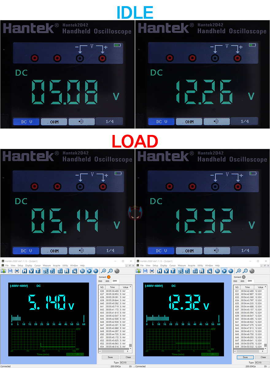 실제로 마이크로닉스 클래식2 풀-체인지 600W 파워서플라이를 사용해보면, 전압 변동폭과 팬 소음을 측정해보는데, 그전에 기본 전압 출력상태를 확인해보면, 인텔 파워서플라이 가이드라인 표준범위에서 정상적으로 출력되는 것을 확인할 수 있습니다. 또한, OCCT 프로그램을 통해 실제 PC 시스템에서 출력되는 5V와 12V의 전압 움직임도 각각 Idle과 Load 상황에서 측정해본 결과 각 상황에서 모두 0.01V 수준으로 매우 작은 움직임으로 출력되는 것을 확인할 수 있었으며, 전체변동폭도 0.05~0.06V 수준으로 매우 작은 편임을 확인할 수 있어서 전압출력이 매우 안정적인 것을 확인할 수 있었습니다. 이정도 수준이면 동급 모델 수준에서 거의 최상급이라 할 수 있죠.