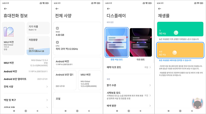 휴대전화정보로 들어가보면, 앞서 언급했듯이 유저인터페이스는 안드로이드 11기반의 MIUI 12.5이며, 홍미10 같은경우 메모리와 저장공간 사양옵션이 4GB+64GB, 4GB+128GB, 6GB+128GB 3가지로 출시되었죠. CPU는 옥타코어로 표시되어있는데, 정확히는 미디어텍사의 헬리오 G88 APU가 탑재되었습니다. 이전 홍미9가 헬리오 G80 APU를 탑재했었는데, 사실 둘의 성능차이는 거의 없는 편이죠. 다만, 헬리오 G88 APU는 최대 카메라화소가 6400만까지 확장되었고, 앞서 언급했듯이 홍미10의 가장 큰 특징인 화면주사율 90Hz이 바로 이 헬리오 G88 APU에 추가된거죠. 실제로 디스플레이 설정으로 들어가면, 다크모드 지원 등의 설정 메뉴 중 재생률에서 60Hz과 90Hz 2가지 화면주사율이 지원되는 걸 확인할 수 있습니다. 참고로, 기본설정은 60Hz으로 되어있기때문에 사용자가 90Hz으로 변경을 해줘야합니다. 체감은 크지 않지만, 그래도 조금 더 부드러운 느낌은 체감합니다.