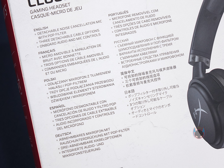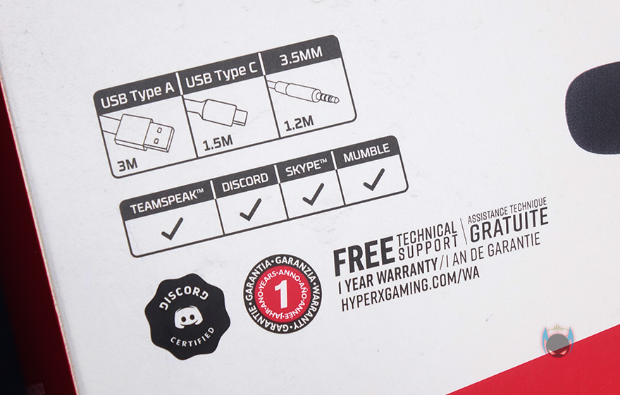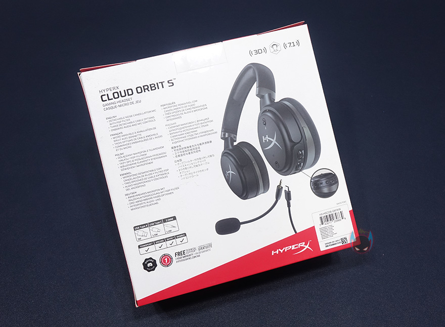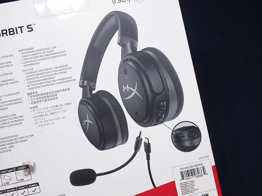 제품박스 뒷면에는 주요 특징을 각 나라별 언어로 표시하고 있으며, 추가적인 제품 이미지를 확인할 수 있는데, 분리형 마이크와 전원케이블 연결을 담았습니다. 그리고, 뒤에서 다시 확인하겠지만, 전원케이블이 무려 3개나 제공되고, 유명 음성 채팅 프로그램들 인증도 받았다라는 것을 확인할 수 있습니다. 하이퍼엑스의 대부분의 게이밍헤드셋 제품들이 최소 2개이상의 음성 채팅 프로그램 인증을 받고 있죠. 제품포장은 고급형 모델답게 속박스와 함께 제품 보호를 위해 스펀지를 사용했으며, 제품 구성은 클라우드 오르빗 S(Cloud Orbit S) 헤드셋, 분리형 마이크, USB Type-A 케이블, USB Type-C 케이블, 3.5mm 오디오 케이블, 전용 파우치, 제품설명서/보증서로 이루어져 있습니다. 물론, 제품 설명서에는 한국어도 포함되어 있죠.