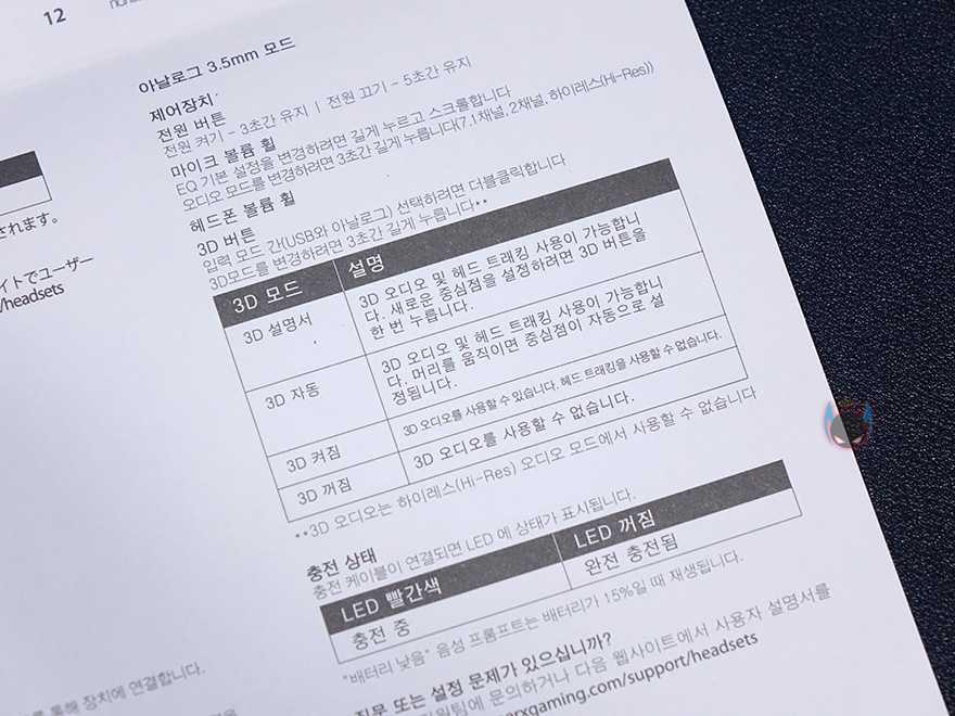 그리고, 또하나의 기술인 Waves Nx 3D 오디오는 말그래도 사운드를 입체감 있게 들여주는 기능인데, 이어-컵에 적용된 3D 버튼을 통해 On/Offf를 포함 총 4개의 모드 전환을 할 수 있는데, On/Off를 제외한 나머지 2개의 모드는 오토(Auto)와 메뉴얼(Manual)로 오토 모드는 사용자가 머리는 움직일때마다 3D 오디오 그러니깐 사운드의 중심이 따라 움직이는 모드이고, 메뉴얼 모드는 사운드가 센터 고정으로 되어있는 형태로 사용자가 머리를 움직이면 사운드 청감차이를 느끼게 해줍니다. 물론, 메뉴얼 모드에서 다시 한 번 모드버튼을 누르면 머리가 움직인 지점에서 새롭게 사운드 센터를 잡아주죠. 당연히 3D 오디오를 켰을 때와 꺼을 때의 사운드 체감도 확실합니다. 3D 오디오일 때가 더 크고, 입체감있죠. 참고로, Waves Nx 헤드 트래킹은 3D 오디오 오토와 메뉴얼일때만 사용 작동됩니다. 그리고, 2채널과 7.1채널 사운드도 지원하고 있어서 이부분도 충분히 사운드 체감을 할 수 있죠.