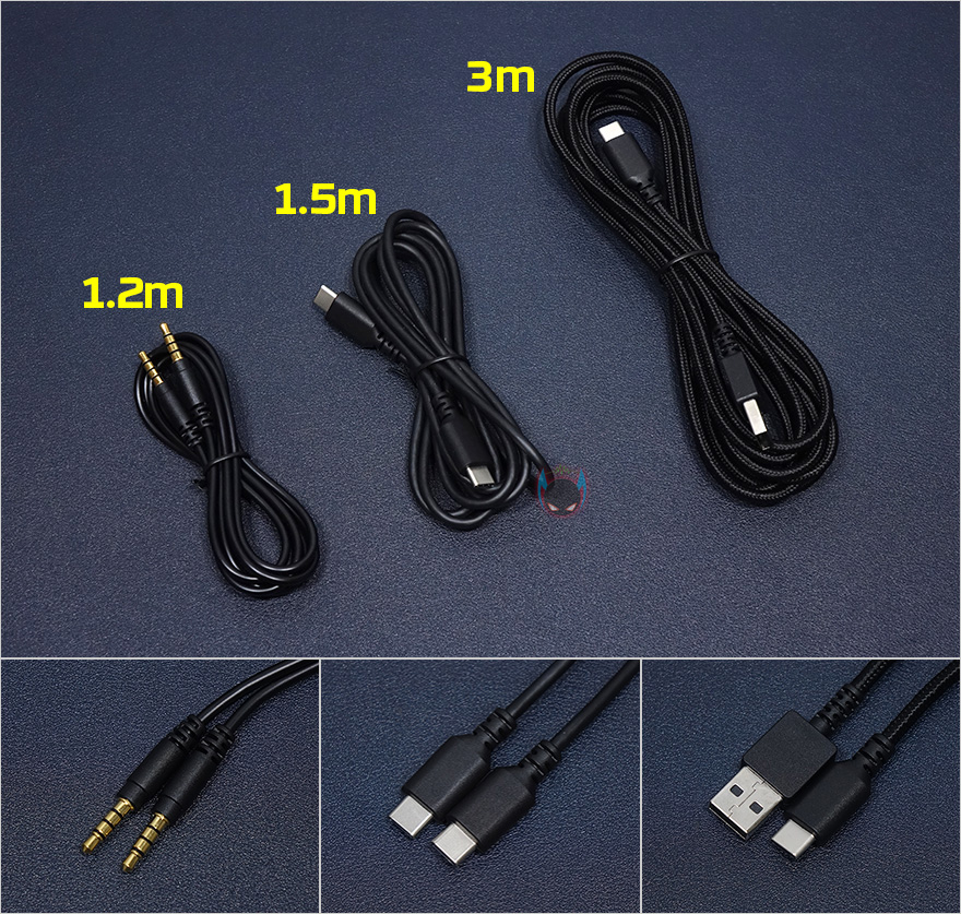 끝으로, 분리형 마이크는 약 160mm 길이로, 사용자 착용에 따라 유연하게 마이크 각도조절을 할 수 있게 플렉시블 형태이며, 마이크부분에 팝-필터가 기본적으로 착용되어 있습니다. 물론, 분리도 가능하죠. 하지만, 이 마이크는 노이즈제거가 적용되어있지 않아서 화이트 노이즈가 발생합니다. 그래서, 게임사용자라면 아마 이부분이 클라우드 오르빗 S 제품에서 가장 아쉬운 부분이 아닐까 생각이드네요. 그리고, 케이블은 앞서 언급했듯이 3개 제공된다고 했는데, 아날로그방식의 3.5mm 오디오 케이블, 디지털방식의 USB Type-C to Type-A 케이블과 USB Type-C to C 케이블 2가지가 제공됩니다. 길이는 각각 1.2m, 3m, 1.5m이고, 오디오케이블은 4극 방식에 신호손실 최소화를 위해 금도금처리도 되어있습니다.