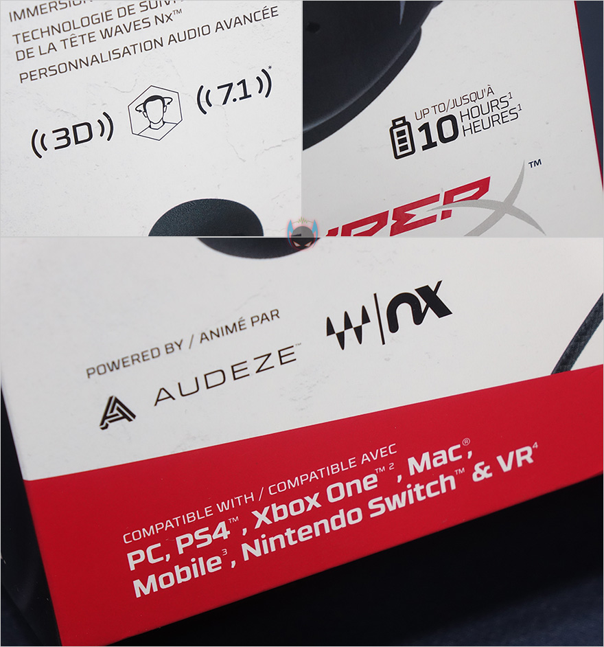제품팩키지 형태는 박스형으로 디자인 기존 제품들과 큰 차이가 없습니다. 하이퍼엑스 게이밍 헤드셋하면 화이트와 레드색상 배경이 빠지지 않죠. 그리고, 전면에는 제품 이미지를 담고 있는데, 클라우드 오르빗 S(Cloud Orbit S) 역시 그대로 적용하고 있습니다. 모델명을 시작으로 이 제품의 주요 특징으로 3D 오디오와 헤드 트래킹, 7.1채널 사운드 표시를 확인할 수 있고, 오디지(Audeze) 합작표시도 확인할 수 있죠. 참고로, 3D 오디오와 헤드 트래킹 모두 오디지(Audeze)의 Waves Nx 기술로 적용되었습니다. 그리고, 호환성표시도 확인할 수 있는데, PC를 비롯해 콘솔, 애플 제품까지 거의 모든 제품에서 사용 가능합니다. 측면에도 호환표시를 다시 확인할 수 있으며, 추가로 하이퍼엑스에서 후원하는 프로게임단과 리그 후원도 확인할 수 있습니다.