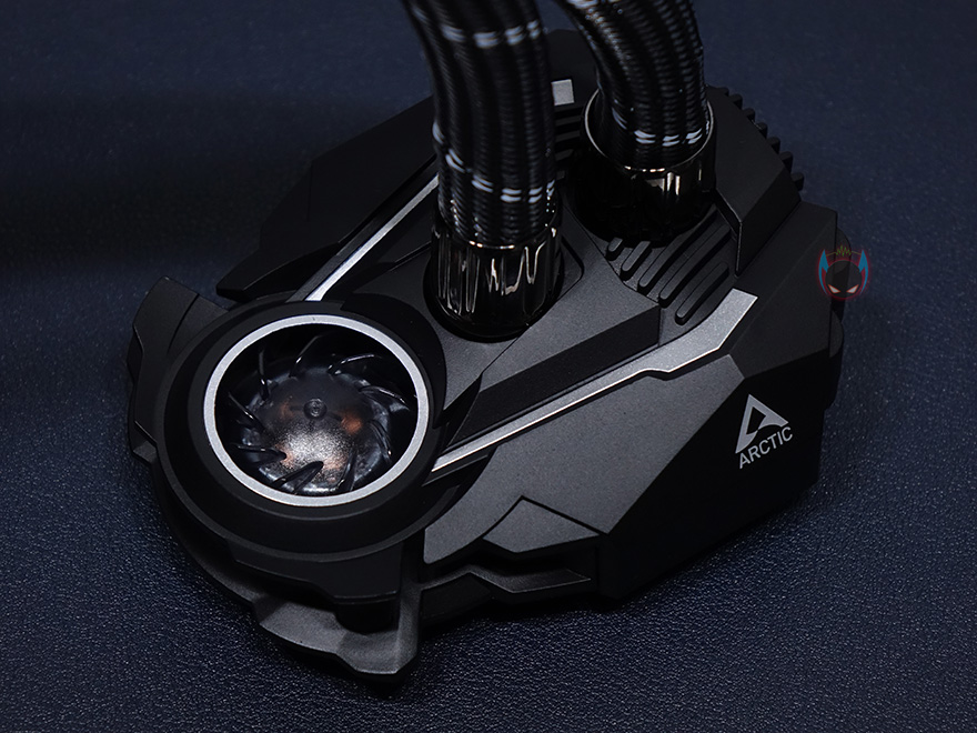 라디에이터와 워터블록을 연결해주는 튜브는 450mm 길이에 전체 직조 슬리빙처리해 꼬임과 흠집방지가 되도록 해놨으며, 양쪽 연결부도 일반적인 고무마감재가 아닌 메탈릭마감재로 고급스러움을 더했습니다. 워터블록은 아틱 자체개발의 펌프로 기존에 보던 일반적인 워터블록과는 확실히 다른 메카닉적인 형태를 가지고 있으며, 한쪽에 작은 팬이 장착된 것을 확인할 수 있는데, 바로 메인보드 전원부(VRM)에 쿨링효과를 줄 수 있게 적용된 VRM 팬입니다. 일반적으로 일체형 수냉쿨러하면 가장 큰 단점이 메인보드 전원부에 쿨링효과를 줄 수 없다라는 점이죠. 그부분을 보완한겁니다. 팬 크기는 40mm이며, 속도는 1000~3000RPM 범위를 가졌습니다. 측면에서보면 팬이 작동하면서 옆으로 풍량을 흘려보내는 구조라는 것을 알 수 있죠.