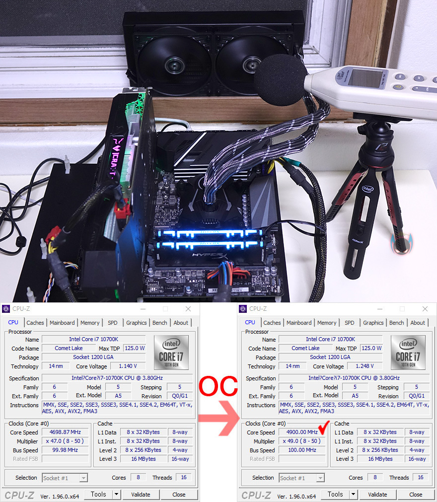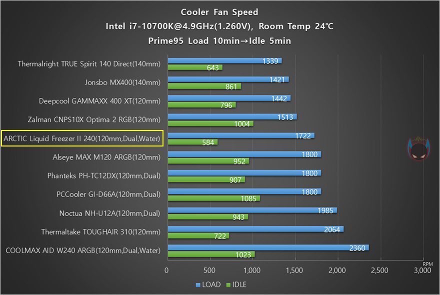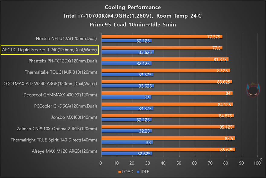 이제, 아틱 Liquid Freezer II 240 일체형 수냉쿨러의 냉각성능을 확인해보는데, 일반적으로 수냉쿨러가 공랭쿨러보다는 성능이 좋기때문에, 인텔 i7-10700K CPU를 4.9GHz로 오버클럭해서 Prime95로 Load 과부하 10분 후 5분 Idle로 돌아가는 진행을 했습니다. 물론, 일체형 수냉쿨러라서해서 무조건 공랭쿨러보다 성능이 좋은 것은 아닙니다. 특히, 240mm 라디에이터경우에는 좀 더 빈번하죠. 그리고, 팬은 메인보드 PWM 자동속도조절 방식 그대로 설정했으며, 워터블록과 팬 소음 측정을 위해 파워서플라이는 팬리스(Fanless)로 사용했습니다.