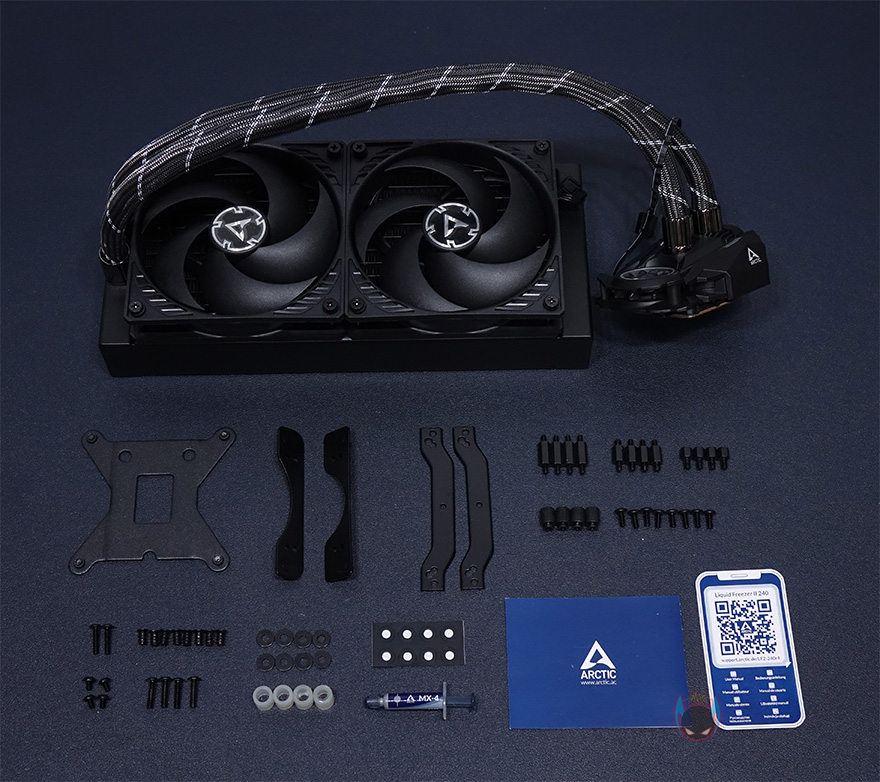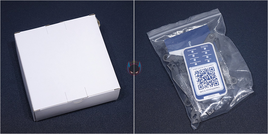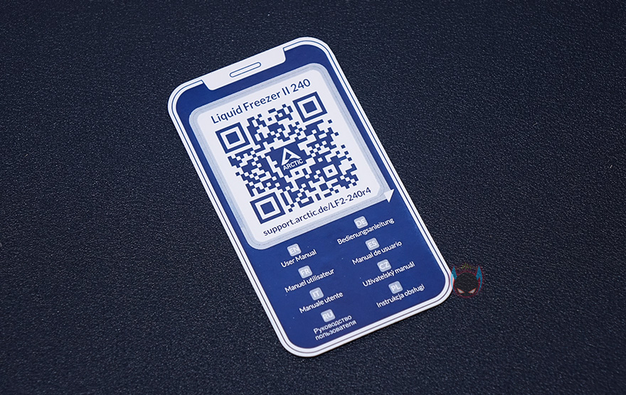 박스 후면에는 제품의 주요 특징을 이미지와 함께 언급하고 있는데, 워터블록, 깔끔한 케이블관리, 전원부 팬 쿨링, 최적화된 팬 제공, 라디에이터를 주요 특징으로 언급하고 있죠. 박스를 열어보면, 다른 수냉쿨러 제품들처럼 쿨러는 비닐포장으로 되어있으며, 부속품들은 별도의 박스 안에 비닐포장되어있습니다. 아틱 Liquid Freezer II 240 일체형 수냉쿨러를 비롯해 제품 구성품에는 인텔용 백플레이트, 인텔용 마운팅 클립, AMD용 마운팅 클립, 소켓별 스탠드-오프, 너트, 라디에이터 및 팬 나사, 스페이서, 와셔, 제품설명서 카드로 이루어져 있습니다. 제품설명서 카드를 말그대로 QR코드 카드로 모바일기기 등으로 스캔에서 아틱 홈페이지에 등록되어있는 Liquid Freezer II 240 모델의 설명서(https://support.arctic.de/lf2-240r4)를 확인할 수 있는데, 최근 모델은 Rev.4 입니다. 접속해보면, 소켓별로 장착법까지 나와있습니다.