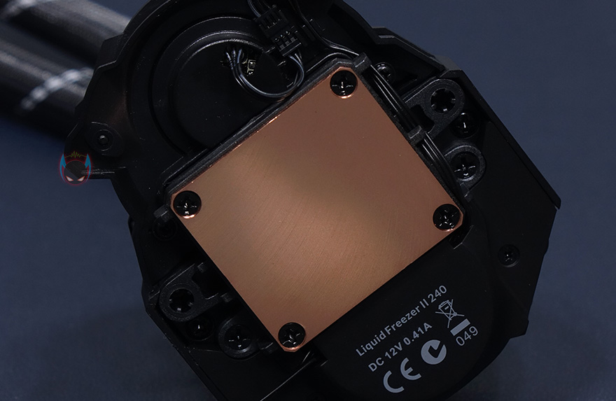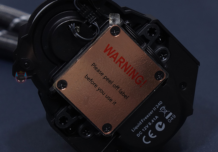 그리고, 워터블록에는 케이블이 1개만 적용되어 있는데, 앞서 본 2개의 팬을 연결해준 Y자 케이블이 워터블록과 연결되고, 이 케이블 하나로 팬과 워터블록 작동까지 모두 해주는겁니다. 쉽게 말해 메인보드에 연결해주는 케이블이 1개밖에 없어서 편리하다라는거죠. 참고로 팬 속도는 200~1800RPM이고, 펌프속도는 800~2000RPM 범위를 가졌습니다. 끝으로, CPU와 맞닿는 베이스부분은 구리재질이며, 구입시에는 보호비닐이 부착되어있고, 떼어내면 매끄럽게 래핑처리된 것을 확인할 수 있습니다. 참고로, 사용시에는 보호비닐을 제거해야합니다.