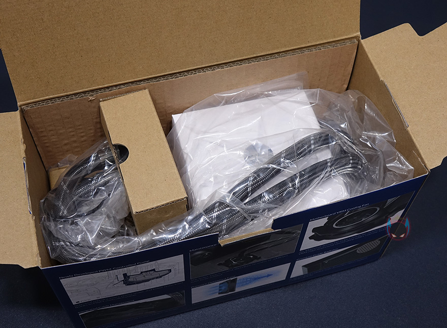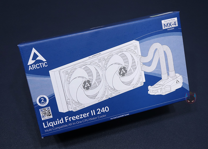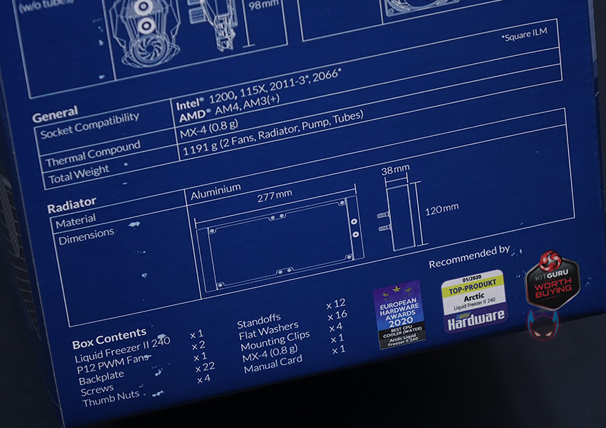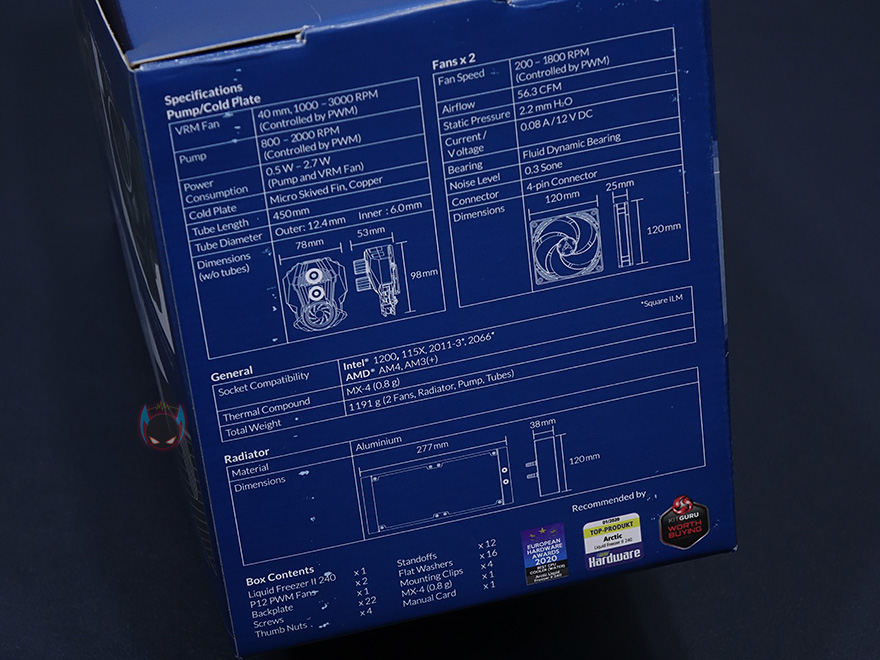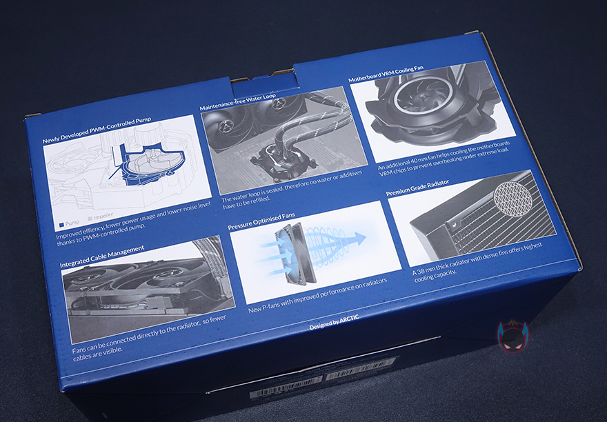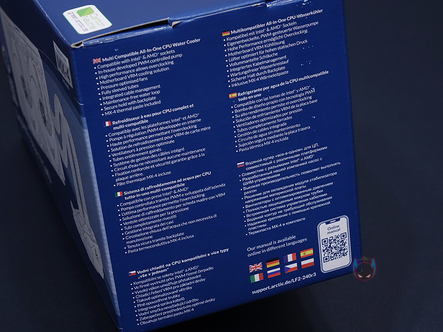 제품팩키지는 박스형태로 전면에 제품 이미지를 담고 있어서, 쿨러 디자인을 미리 짐작할 수 있습니다. 그리고, 모델명과 함께 2년의 보증기간이 표시되어있는데, 참고로 이건 예전 정책이고 최근에 새롭게 보증정책이 바뀌면서 6년까지 연장되었습니다. 그리고, 아틱하면 대표적인 써멀컴파운드 MX-4도 포함되어있다라는 표시도 확인할 수 있죠. 박스 한쪽 측면에는 유럽 일부국가 언어로 제품 특징을 표기해놨으며, 반대 측면에는 제품의 기본사양을 표기해놨는데, 워터블록과 팬 사양 그리고, 소켓지원과 라디에이터 사이즈까지 담겨져 있어서 구입전 충분히 도움이 되겠습니다. 또한, 맨 아래에는 제품의 구성목록도 확인할 수 있죠.