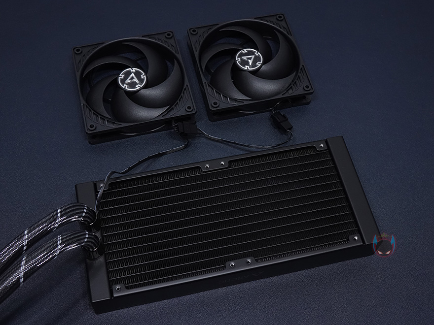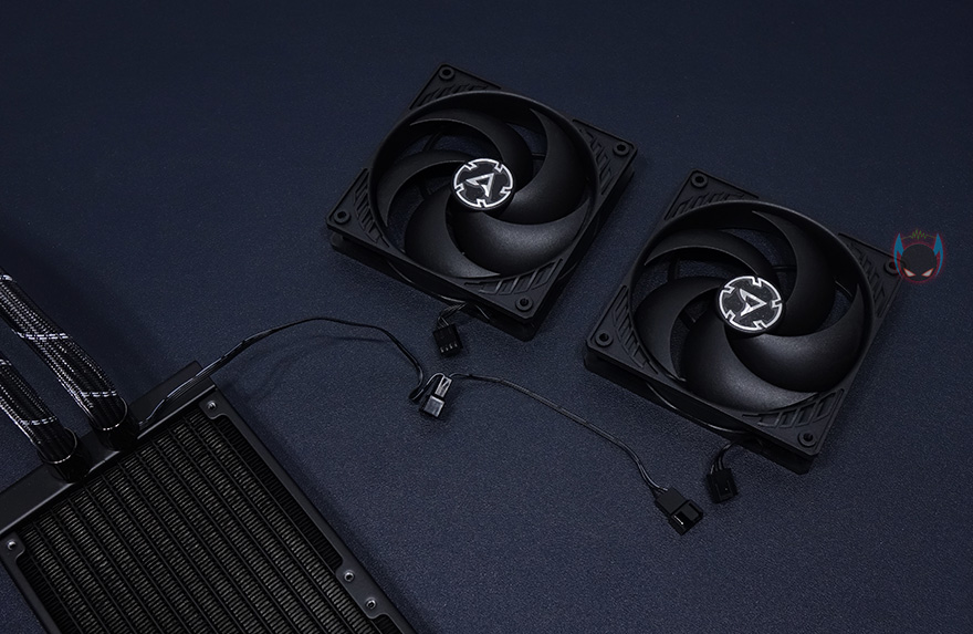 아틱 Liquid Freezer II 240 일체형 수냉쿨러를 살펴보면, 일단 라디에이터부분에는 기본적으로 120mm 팬 2개가 장착되어있습니다. 대부분 사용자가 직접 장착하게 따로 분리되어서 제공해주는 경우가 많은데, 이렇게 미리 장착되어있으면 장착하는 소요시간을 단축할 수 있어서 좋죠. 팬은 아틱의 대표 인기모델 P12 PWM 모델로 5개의 블레이드(날개)에 일반적인 팬보다 날개 회전각도가 더 많이 돌아간 형태입니다. 일반적으로 이런형태를 터빈 블레이드라 부르는데, RGB효과보다 쿨링성능에 중요시하는 제품들에서 많이 볼 수 있죠. 물론, 팬을 라디에이터에서 분리할 수 있습니다. 분리해서 보면, 각 팬의 케이블 길이는 짧고, Y자 케이블로 연결된 것을 확인할 수 있죠. 그리고, Y자 케이블은 튜브와 함께 슬리빙처리된 것을 확인할 수 있습니다. 이렇게 하면 일반적인 일체형 수냉쿨러에서 흔히하는 케이블정리를 따로 할 필요가 없어서 소비자입장에선 편하다할 수 있죠.