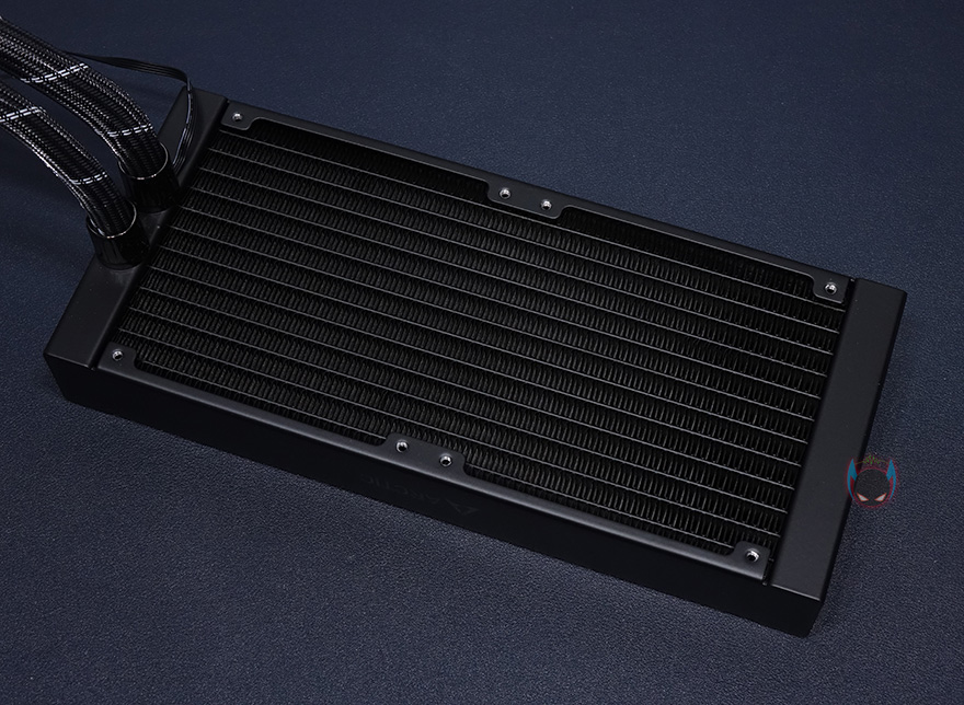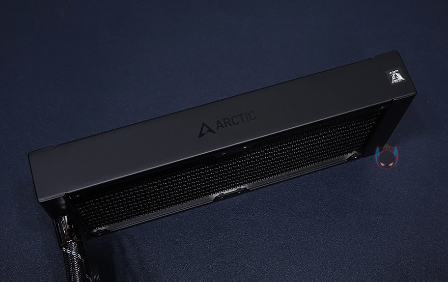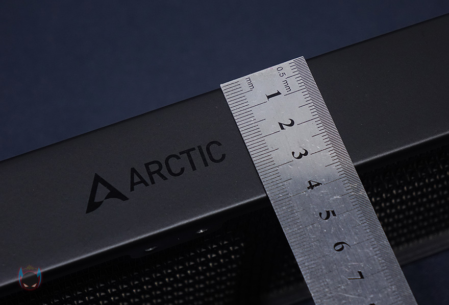 그리고, 팬을 분리한 후 라디에이터만 살펴보면, 잘 배열된 핀과 함께 측면에 아틱 로고를 확인할 수 있고 한눈에 봐도 라디에이터 두께가 두껍다라는 것을 알 수 있습니다. 일반적으로 27mm 두께를 많이 사용하는데, Liquid Freezer II 240 모델은 38mm 두께를 사용했죠. 이런부분들 역시 쿨링성능에 영향을 줍니다. 물론, 두께가 두꺼운만큼 PC케이스 내부도 넉넉해야겠죠. 그리고, 이번에 아틱 제품을 국내 유통하게된 피씨디렉트의 정품스티커도 꼭 제품에 부착을 해야 A/S 받을 수 있다라점 참고하기 바랍니다.