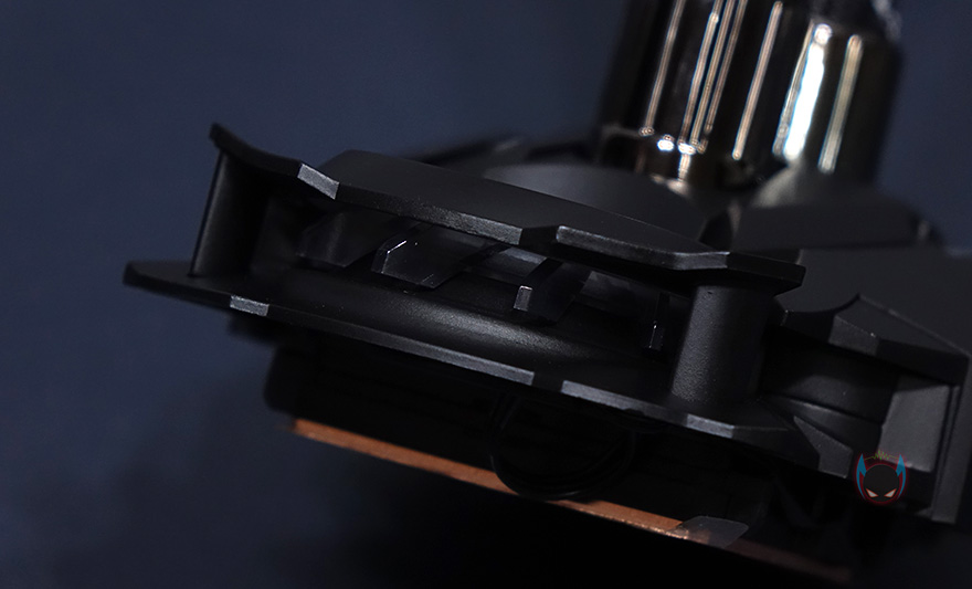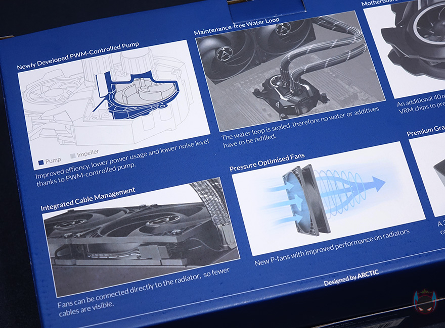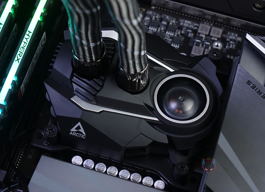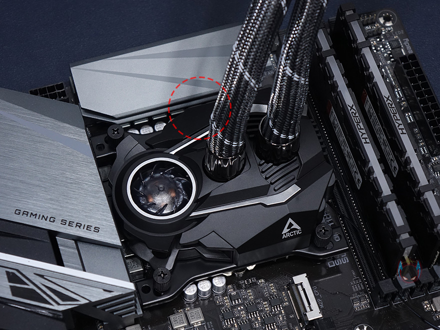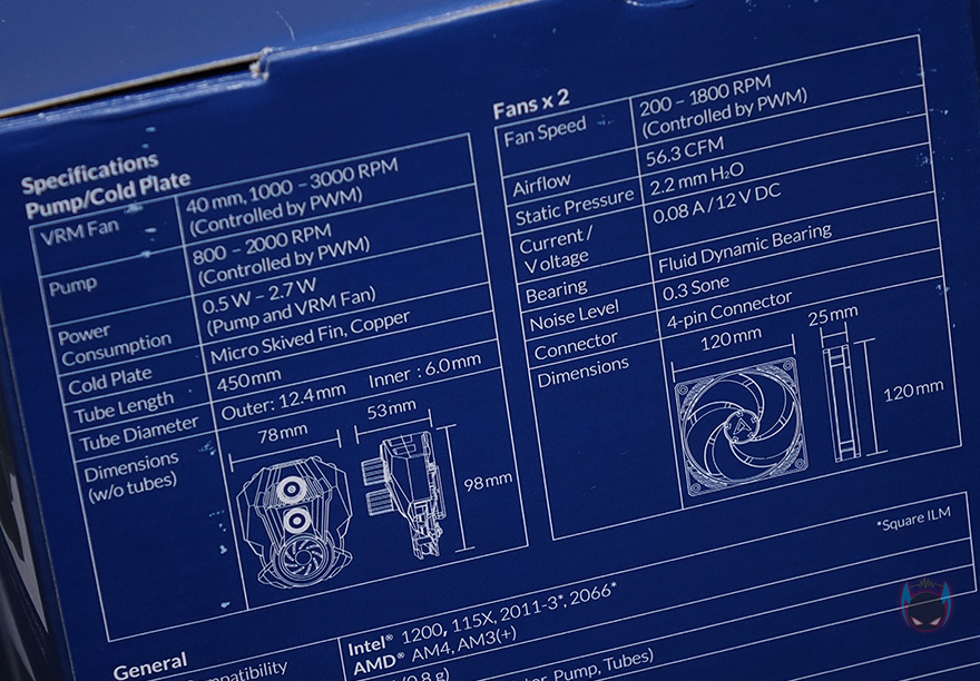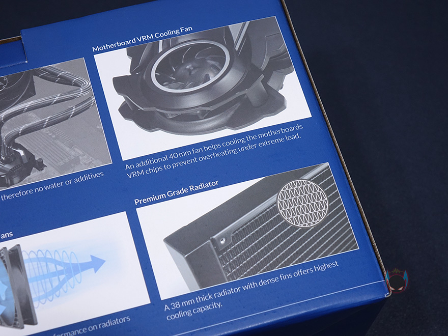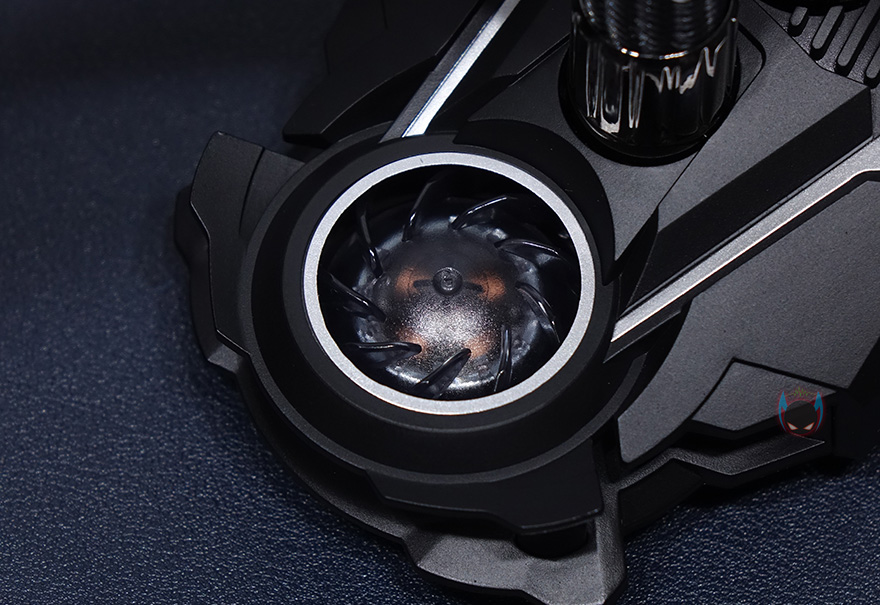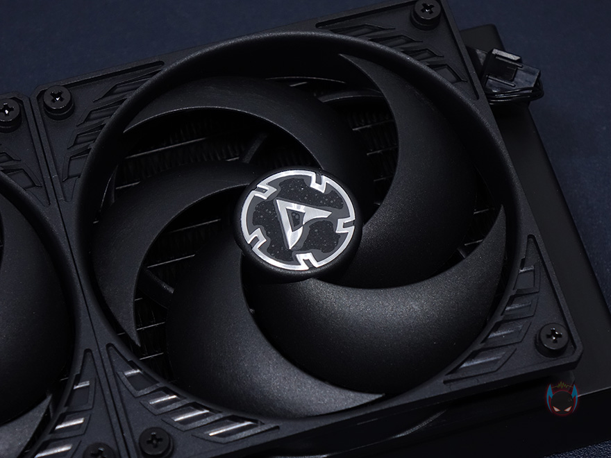 라디에이터와 워터블록을 연결해주는 튜브는 450mm 길이에 전체 직조 슬리빙처리해 꼬임과 흠집방지가 되도록 해놨으며, 양쪽 연결부도 일반적인 고무마감재가 아닌 메탈릭마감재로 고급스러움을 더했습니다. 워터블록은 아틱 자체개발의 펌프로 기존에 보던 일반적인 워터블록과는 확실히 다른 메카닉적인 형태를 가지고 있으며, 한쪽에 작은 팬이 장착된 것을 확인할 수 있는데, 바로 메인보드 전원부(VRM)에 쿨링효과를 줄 수 있게 적용된 VRM 팬입니다. 일반적으로 일체형 수냉쿨러하면 가장 큰 단점이 메인보드 전원부에 쿨링효과를 줄 수 없다라는 점이죠. 그부분을 보완한겁니다. 팬 크기는 40mm이며, 속도는 1000~3000RPM 범위를 가졌습니다. 측면에서보면 팬이 작동하면서 옆으로 풍량을 흘려보내는 구조라는 것을 알 수 있죠.