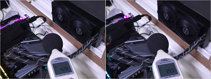 끝으로, 진행동안 아틱 Liquid Freezer II 240 일체형 수냉쿨러 팬 속도와 워터블록&팬의 소음을 측정해봤는데, 팬 속도 같은경우 최소580~최대1700RPM대로 작동했으며, 소음 측정결과 Load상황에선 약 43dB(A), Idle상황에선 약 39dB(A)로 둘 다 속도대비 정숙한 소음대를 보여줬습니다. 이는 확실히 아틱 Liquid Freezer II 240 일체형 수냉쿨러에 장착된 P12 PWM 팬의 저소음 장점을 그대로 반영하고 있다고할 수 있죠.